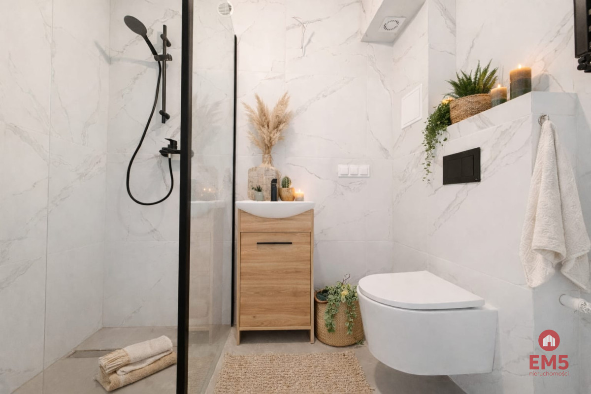 - łazienka z prysznicem, WC i umywalką,