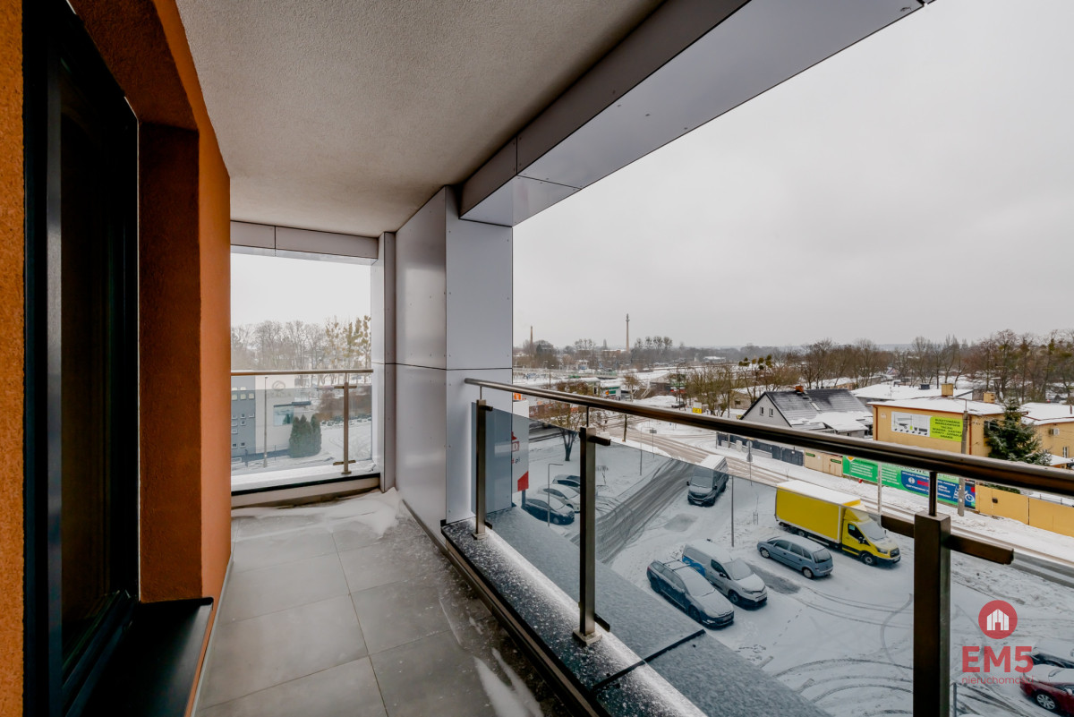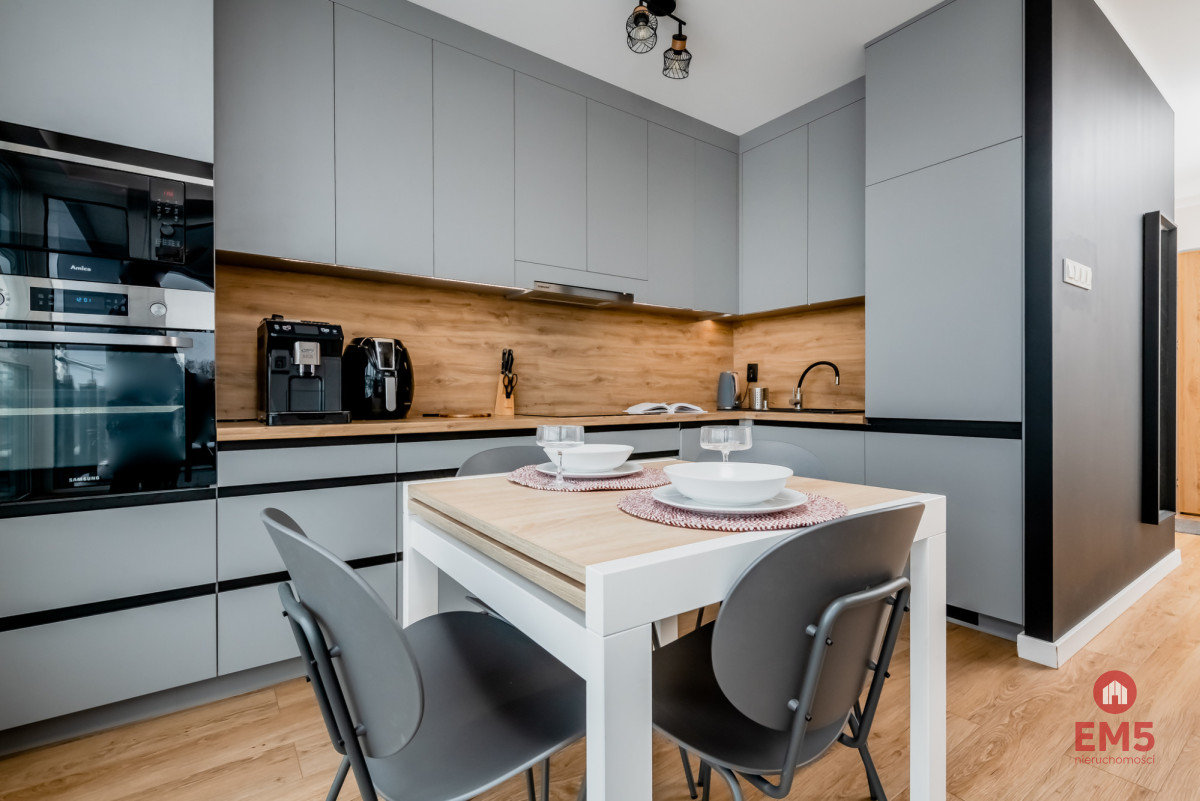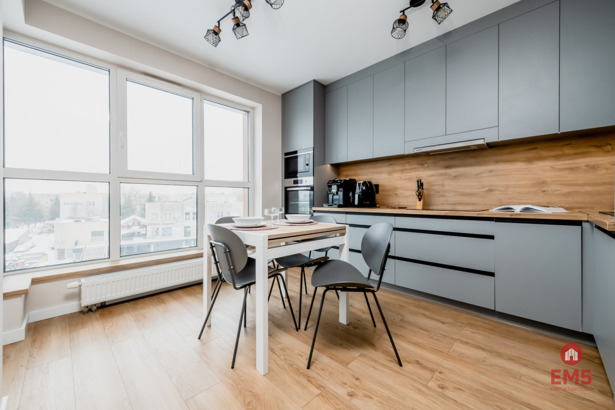 Nieruchomość oferuje pełne wyposażenie wraz z kompletnym AGD oraz przynależną komórkę lokatorską. Panoramiczne okna zapewniają otwartą przestrzeń i piękny widok bez sąsiednich bloków. Istnieje możliwość dokupienia miejsca postojowego w garażu w cenie 45 000 zł. Lokal znajduje się w komfortowej lokalizacji — tuż przy budynku mieści się sklep Aldi, a w pobliżu znajdują się apteka, restauracje, przychodnia oraz przystanek autobusowy linii nr 22; dojazd do centrum zajmuje około 7 minut samochodem.