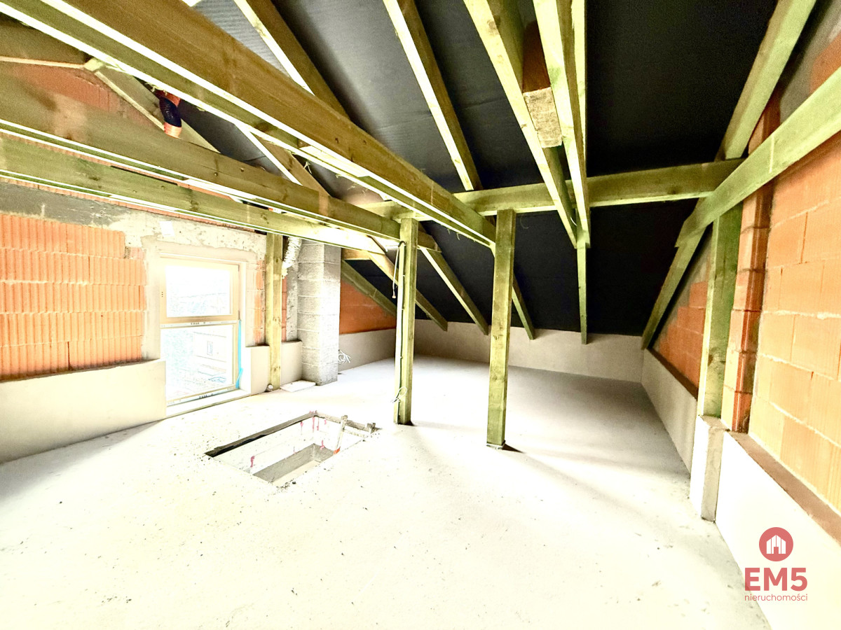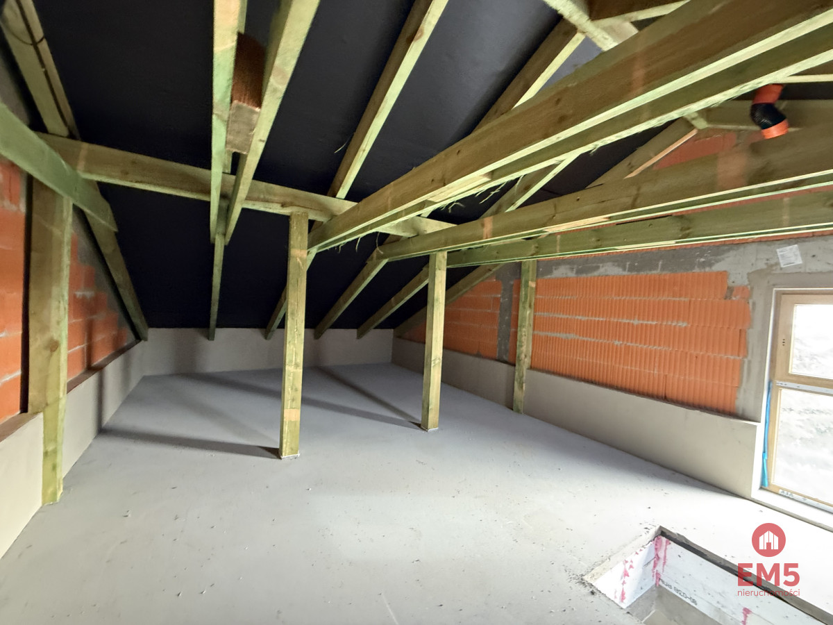 Na parterze znajduje się przestronny salon z aneksem kuchennym i wyjściem do ogródka o powierzchni około 25 m², dodatkowy pokój idealny na gabinet lub sypialnię, WC oraz wiatrołap. Na piętrze mieszczą się dwie ustawne sypialnie oraz łazienka. Dodatkowym atutem jest poddasze do własnego zagospodarowania, co daje możliwość stworzenia dodatkowej przestrzeni według indywidualnych potrzeb.