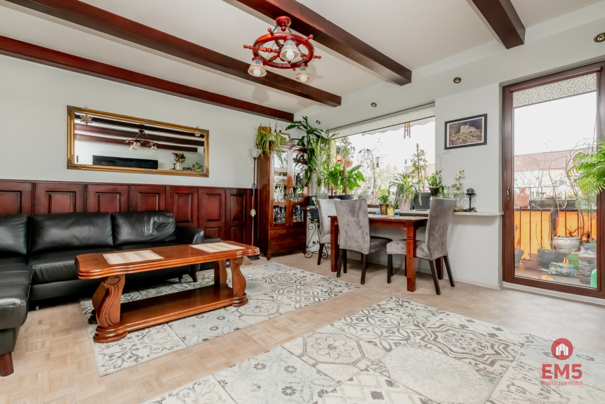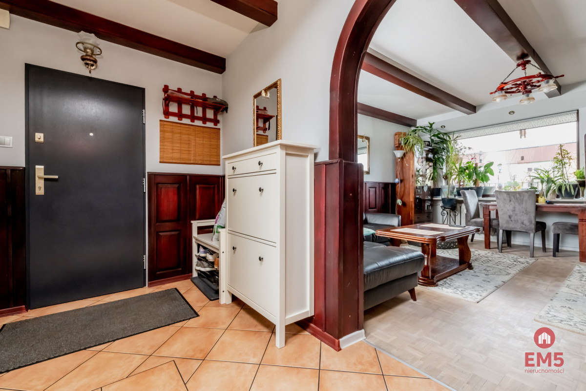 Szukasz przestronnego i funkcjonalnego mieszkania gdzie każdy z członków rodziny będzie miał miejsce tylko dla siebie? To wyjątkowe wnętrze z niepowtarzalnym klimatem może stać się Twoim miejscem na ziemi. Przekraczając próg mieszkania wchodzimy do przedpokoju w którym głównym akcentem jest okno wpuszczające naturalne światło. Do centralnej części mieszkania powadzi przejście z łukiem wykończonym drewnem. Przestronny salon utrzymuje ten przytulny klimat: belki na suficie, drewno na ścianach, bielona podłoga. tu mamy też wyście na duży balkon z widokiem na zieleń. Trzy odrębne sypialnie to dodatkowa przestrzeń do pracy, przechowywania czy odpoczynku i relaksu. Oddzielna kuchnia łączy przemyślaną organizację stref roboczych oraz wygodne systemy przechowywania zapewniając maksymalną wygodę w użytkowaniu. Dodatkowy atut to dwa pomieszczenia sanitarne-łazienka z wanną i szafkami do przechowywania i oddzielna toaleta.