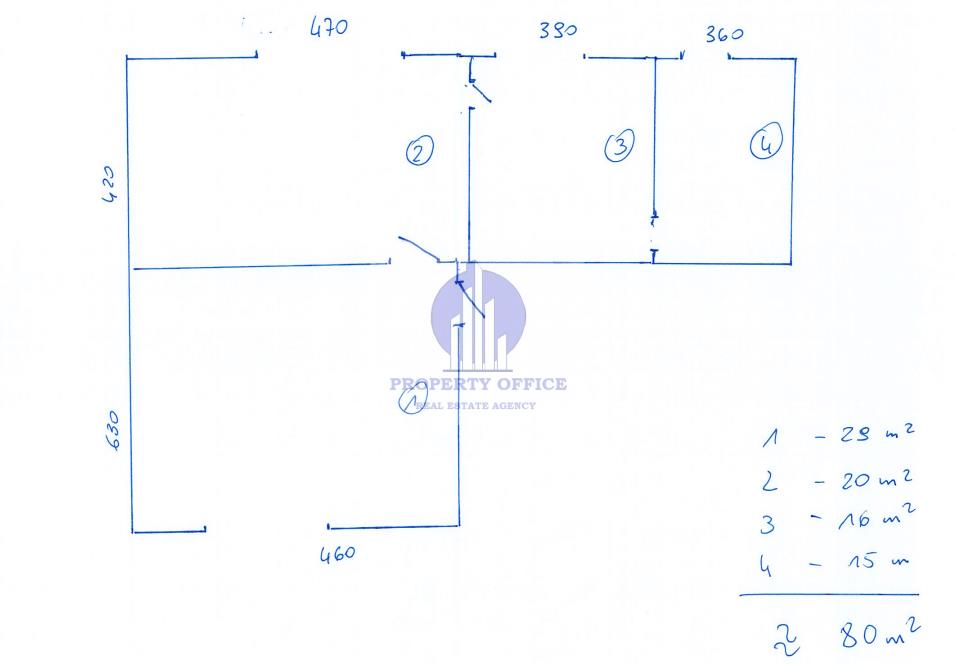 Obecny podział obejmuje 4 pomieszczenia wielkości: 29m2, 20m2, 16m2 oraz 15m2.