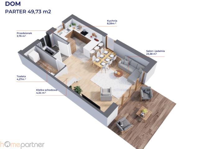 Parter: dobrze doświetlony salon z aneksem kuchennym, toaleta, przedsionek z miejscem na zabudowę szaf
