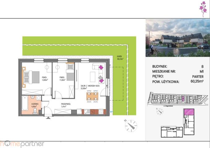 Powierzchnia mieszkania: 60,25 m + 80,23 m ogrodu