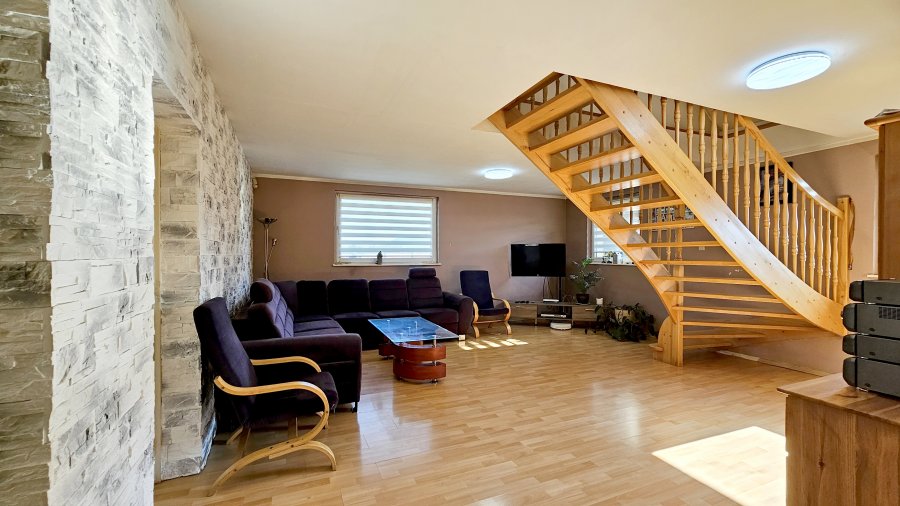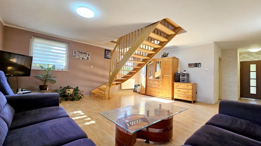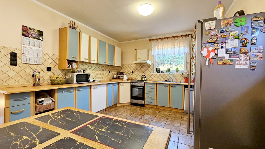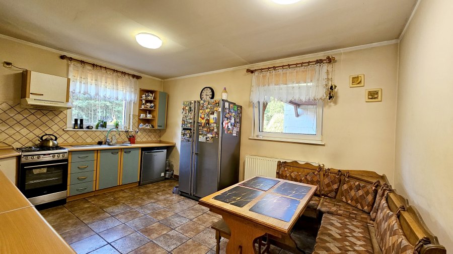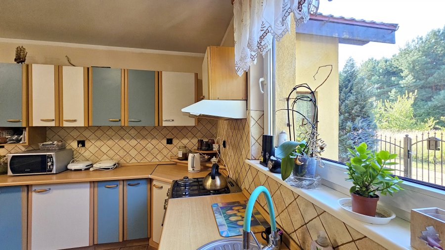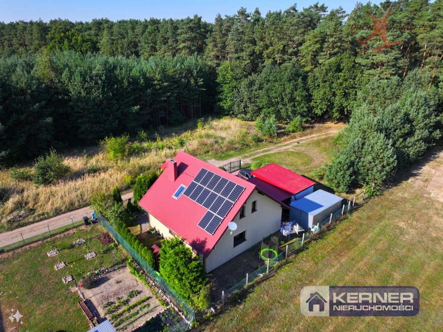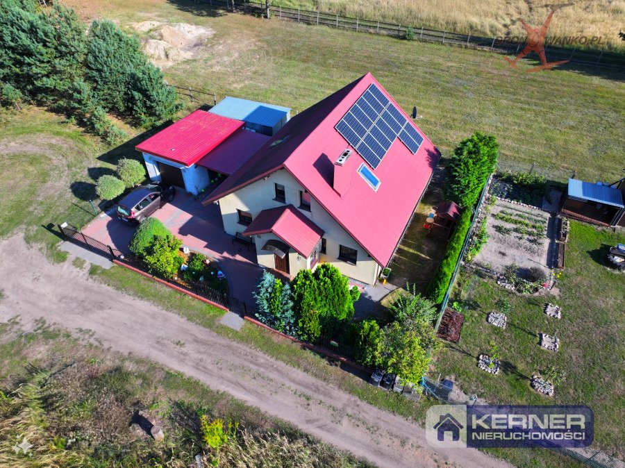 Polecamy Państwu DOM WOLNOSTOJĄCY o powierzchni użytkowej: 125 m2, całkowitej: 140 m2 oraz GARAŻ WOLNOSTOJĄCY o powierzchni: 24 m2, położony na działce o powierzchni: 429 m2 k/Goleniowa. Dach dwuspadowy pokryty blachodachówką. Budynek 2-kondygnacyjny. Na parterze znajdują się: duży salon (pokój dzienny), sypialnia, kuchnia ze strefą jadalnianą, łazienka, korytarz, pomieszczenie gospodarcze (kotłownia) oraz wiatrołap (ganek). Na poddasze prowadzą schody drewniane, gdzie znajdują się: 3 sypialnie oraz przedpokój. Dodatkowo zostały wyprowadzone media z możliwością zrobienia drugiej łazienki lub kuchni. W pokoju dziennym (salonie) oraz sypialniach na podłogach położone są: panele podłogowe; ściany gładzone, malowane, regipsy; w salonie częściowo płytki dekoracyjne (piaskowiec). Łazienka z WC, wykończona glazurą i terakotą; wyposażenie: kabina prysznicowa, wanna narożna, meble łazienkowe z lustrem, umywalka, grzejnik drabinkowy oraz pralka. W kuchni na podłodze terakota; ściany: gładzone malowane oraz pas glazury; wyposażenie: meble kuchenne, kuchenka gazowa z piekarnikiem, zmywarka, okap, kuchenka mikrofalowa. Na korytarzu na podłodze: terakota; ściany: płytki dekoracyjne (piaskowiec). Wiatrołap (ganek), na podłodze: gres; ściany: gładzone, malowane. Okna PVC. Ogrzewanie oraz źródło c. w.: piec c.o. z podajnikiem na eko-groszek oraz instalacja paneli fotowoltaicznych. Media: prąd, woda, kanalizacja miejska, szybki internet (światłowód). Teren wokół domu zagospodarowany.Obok domu znajdują się: murowany garaż wolnostojący o powierzchni: 24 m2 oraz wiata. Dom gotowy do zamieszkania. Polecamy z uwagi na lokalizację, układ, niskie koszty utrzymania, lokatę kapitału jako inwestycję w nieruchomości, możliwości zarobkowe (wynajem) oraz atrakcyjną cenę do negocjacji. Istnieje możliwość zamiany na mieszkanie z dopłatą. Polecamy i Zapraszamy na Prezentację.