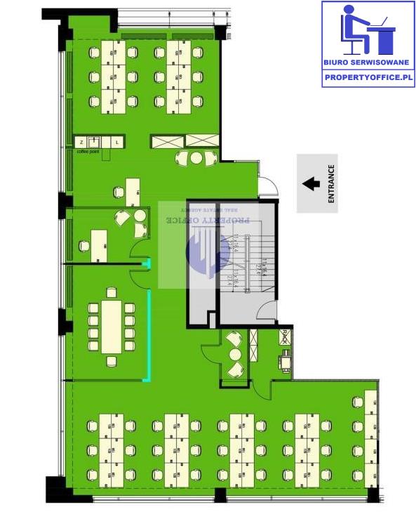 Umeblowane biuro dla 42 osób znajdujące się na 4 piętrze nowoczesnego biurowca.