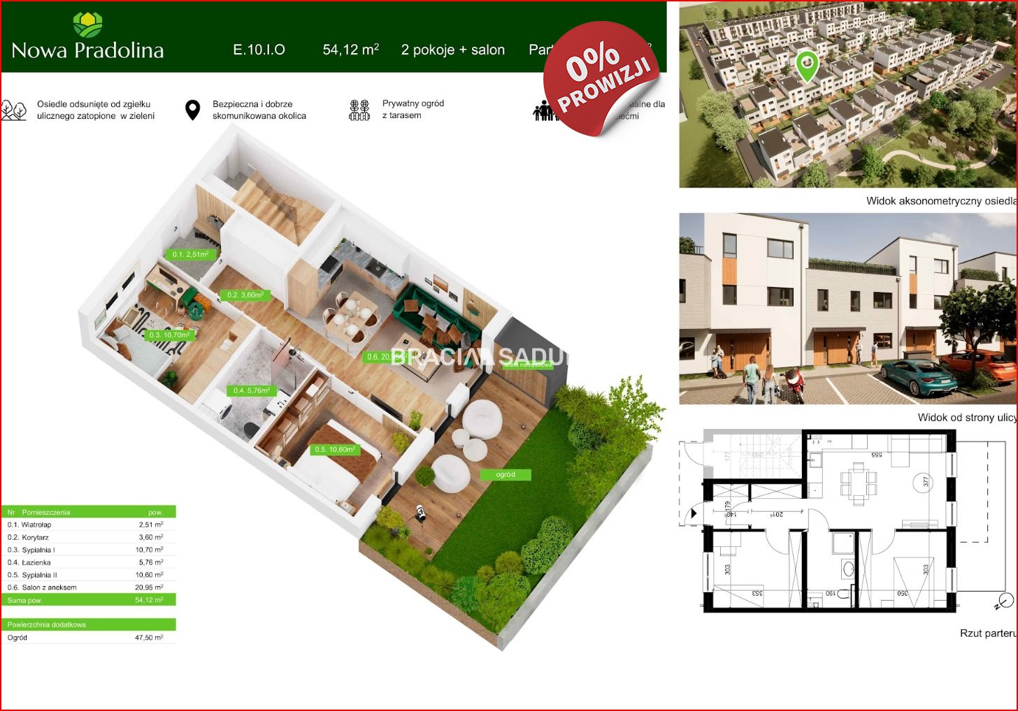 Prezentowane mieszkanie o pow. 54,12 m 2 , znajduje się na parterze. Mieszkanie posiada ogródek o pow. 47,5 m 2 . Składa się z salonu z aneksem kuchennym pow. 20,95 m 2 , 2 sypialni o pow. 10,60 m 2 i 10,70 m 2 , łazienki ( 5,76 m 2 ) oraz wiatrołapu i przedpokoju. W ogródku dodatkowo komórka narzędziowa.