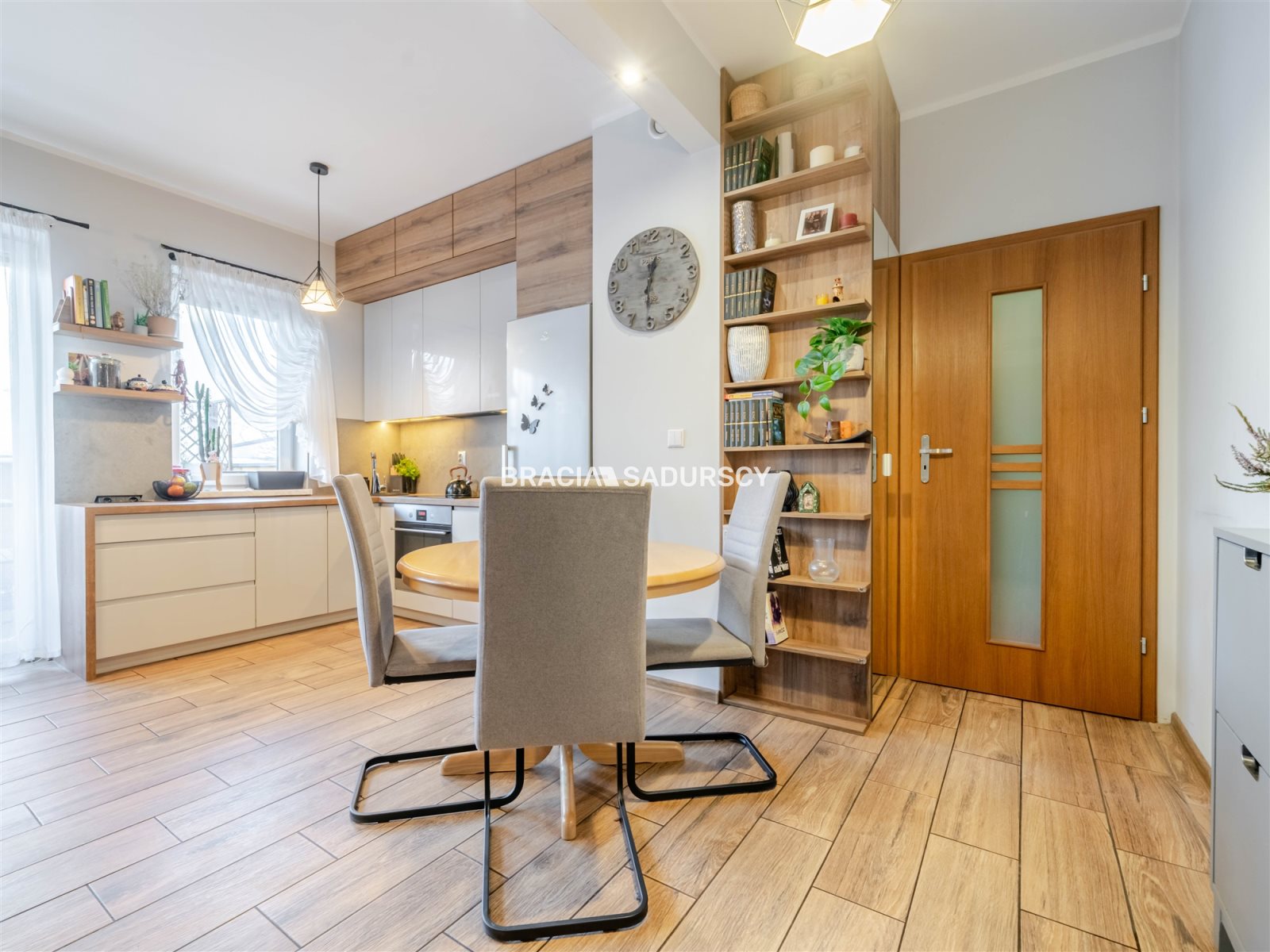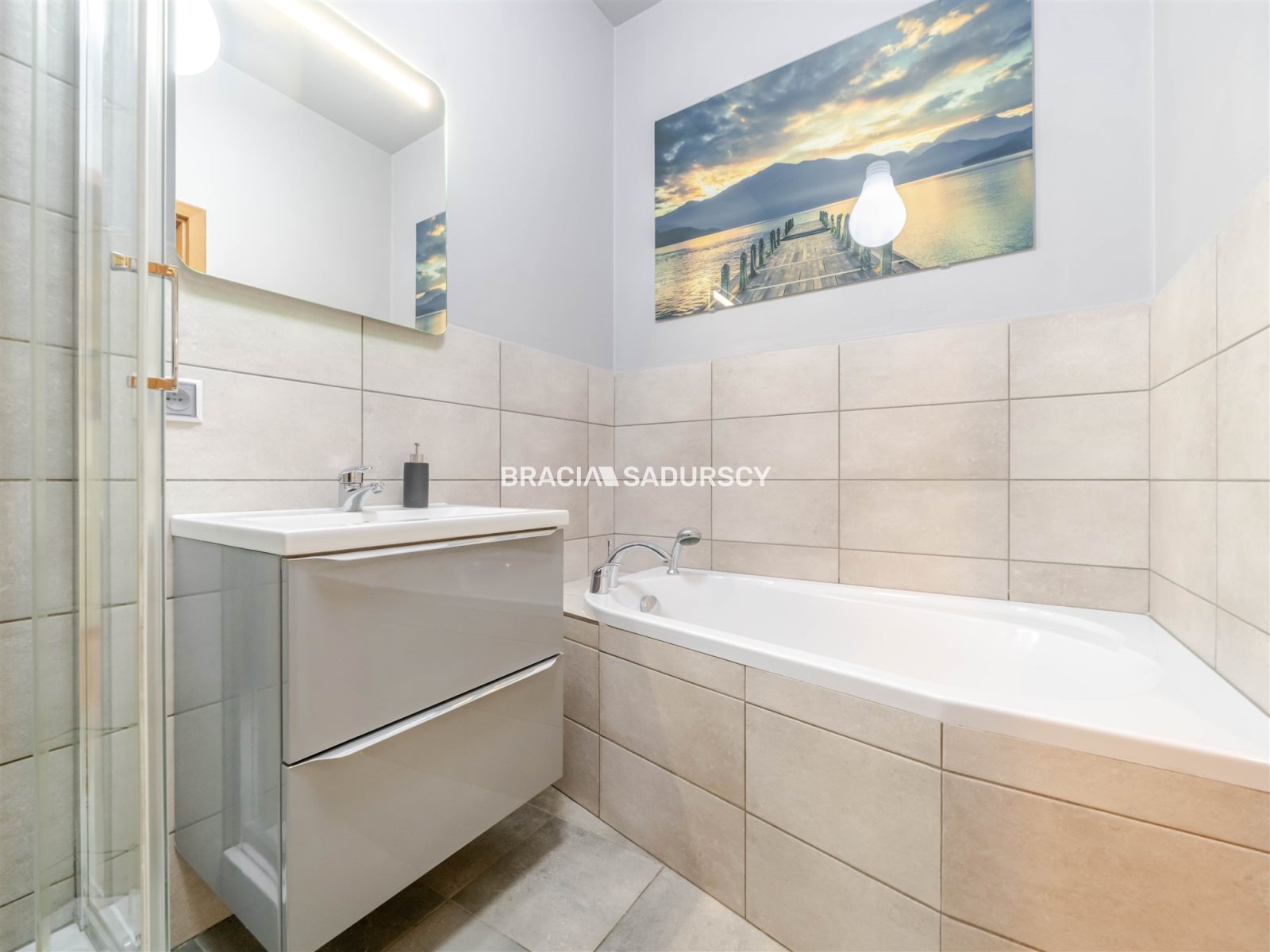 Kuchnia jest wyposażona w sprzęt AGD - zmywarkę, lodówko‑zamrażarkę, piekarnik oraz płytę indukcyjną. Szafy wykonano na wymiar przez stolarza, a w łazience zastosowano elegancką ceramikę i armaturę. Ogrzewanie i ciepła woda pochodzą z sieci miejskiej MPEC.