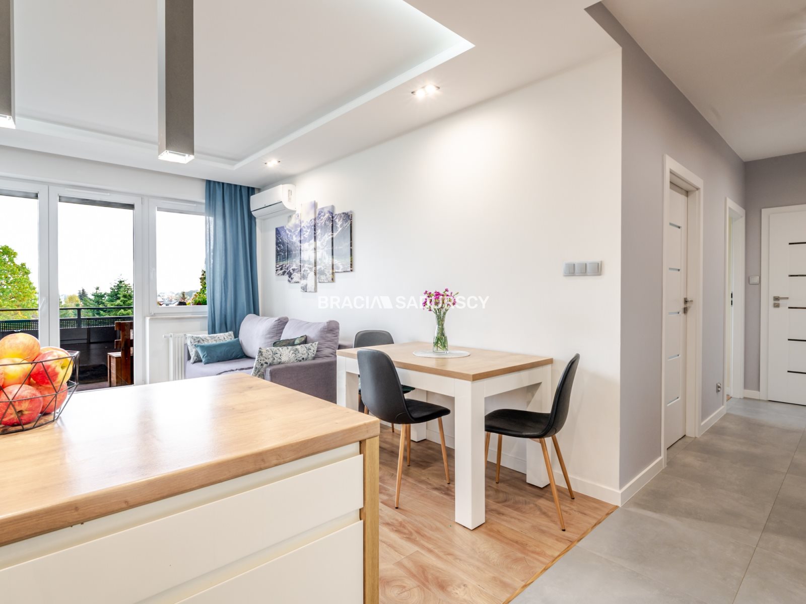 salon z aneksem kuchennym i wyjściem na balkon,