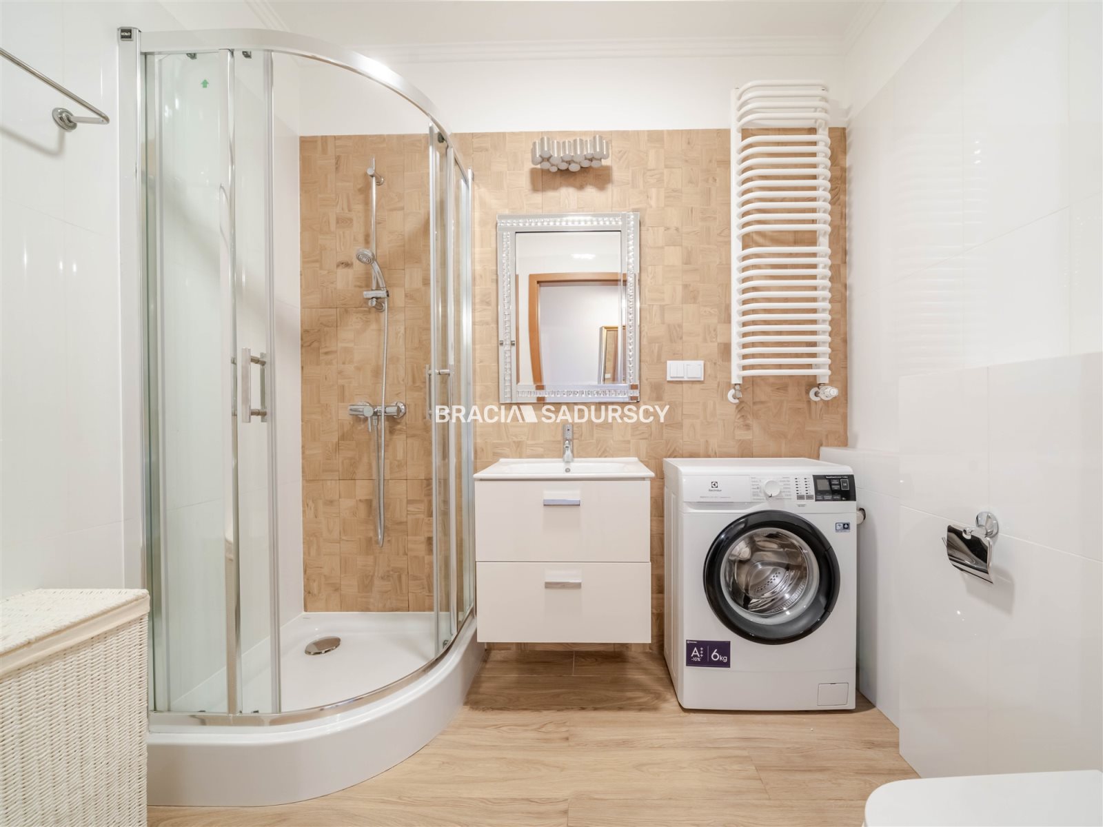 Dwa mniejsze pokoje umeblowane, z oknami na północ. W salonie zamontowana klimatyzacja. Aneks kuchenny w pełni wyposażony: lodówka, piekarnik, zmywarka, płyta indukcyjna, okap. Łazienka z kabiną prysznicową, pralką i WC. Do mieszkania przynależy miejsce postojowe w garażu podziemnym, płatne oddzielnie w cenie 100 000 zł.