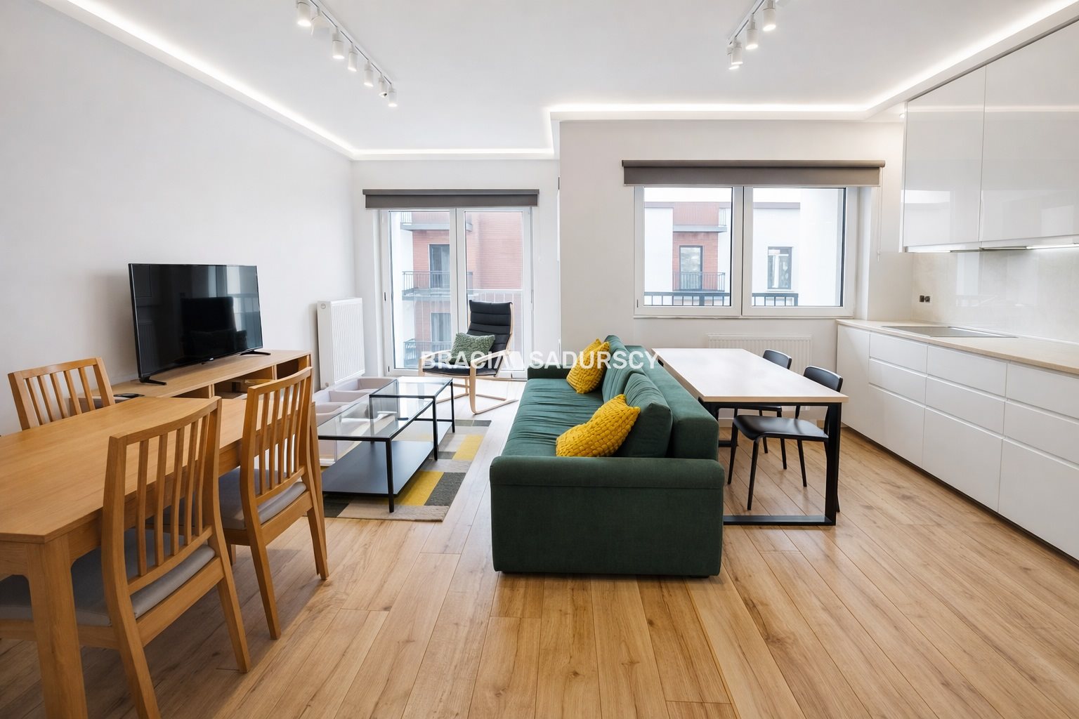 -aneksu kuchennego połączonego z salonem z którego jest wyjście na duży balkon.