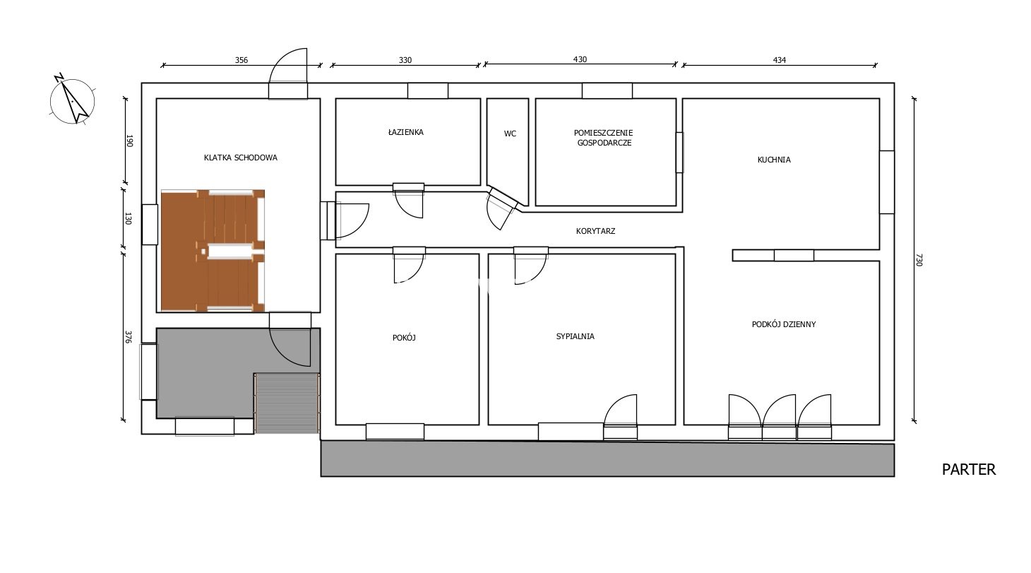 Parter o pow. użytkowej 108,30 m2 składa się z: 3 pokoi, kuchni, łazienki, przedpokoju oraz pomieszczenia gospodarczego.