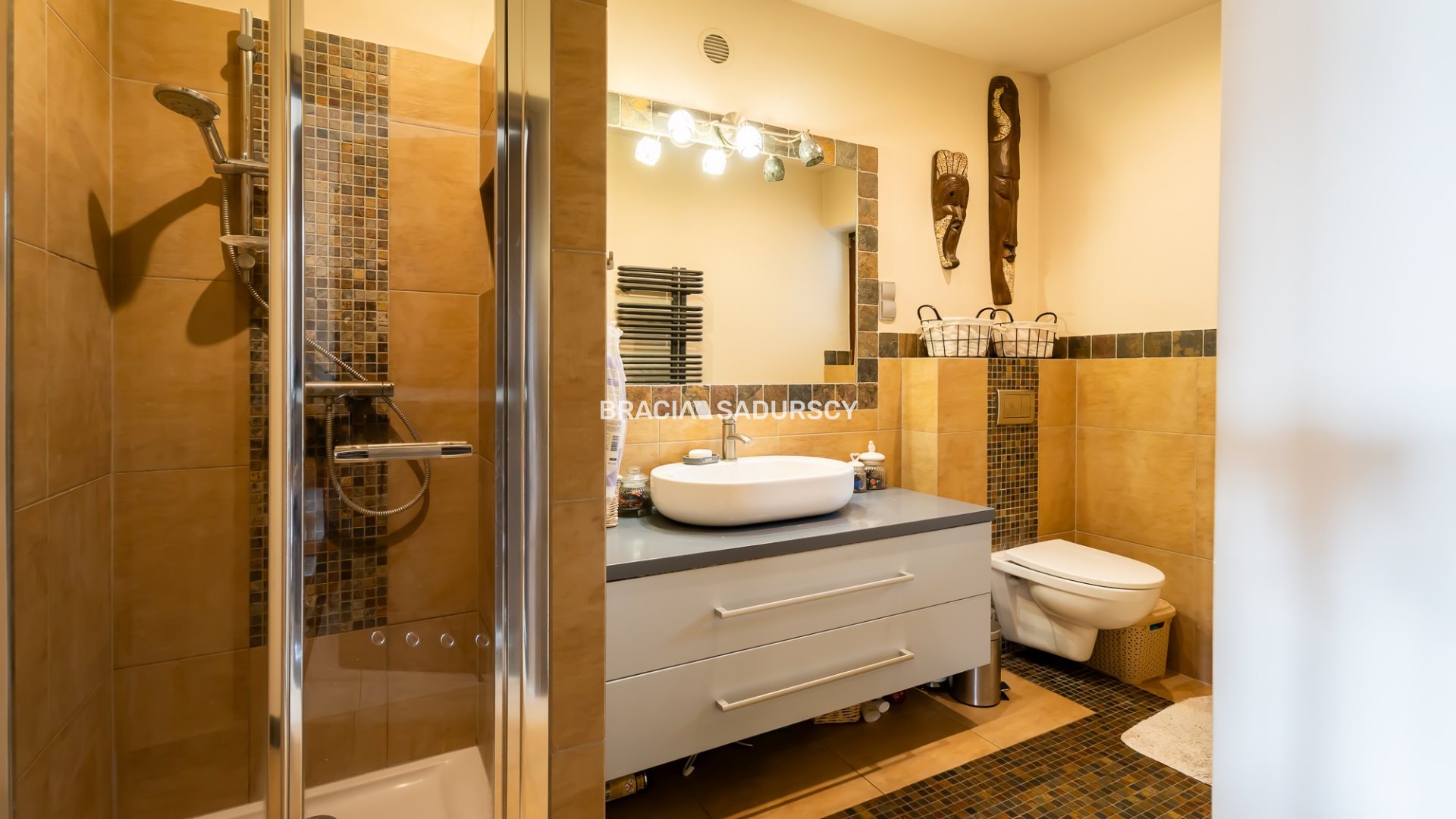 komfortowy pokój kąpielowy z wanną i prysznicem, idealny na chwile relaksu po całym dniu.
