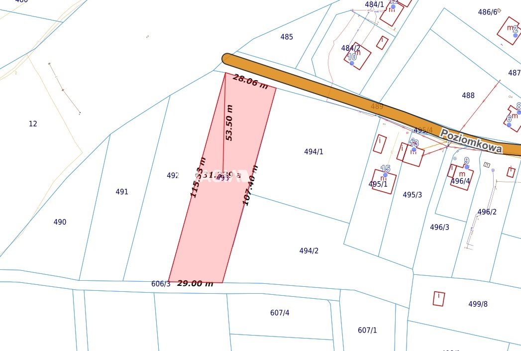 Powierzchnia działki 31 arów, wymiary około 28 m x 110 m. Nieruchomość przylega do ulicy Poziomkowej z dobrym dojazdem do centrum Krakowa.