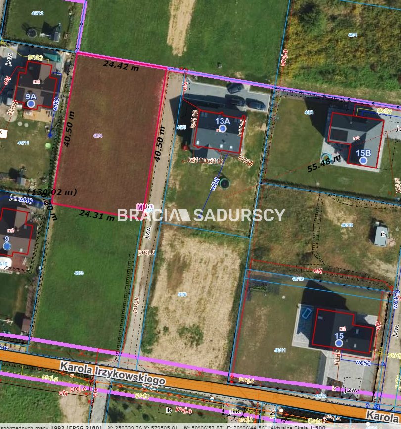 Nowa Huta, Łuczanowice, ul. Irzykowskiego. Działka budowlana o powierzchni 1000m2 w drugiej linii zabudowy. Nieruchomość na obrzeżach miasta, w sąsiedztwie nowe domy. Działka płaska, w kształcie prostokąta. Wymiary długość 40 m, szerokość 25 m. Swoim szerszym bokiem przylega do prywatnej utwardzonej drogi. Kupujący wraz z działką nabywa udziały w drodze dojazdowej. Działka świetnie nasłoneczniona. Teren zlokalizowany jest w cichej okolicy, z dala od głównej drogi co stwarza idealne warunki do odpoczynku. W najbliższym sąsiedztwie są nowo wybudowane rezydencje lub będące w budowie nowe domy, oraz pola niezabudowane. Działka idealna jako inwestycja. Po wykonaniu poszerzenia drogi, chodników i doprowadzeniu kanalizacji oraz przedłużeniu wodociągu jej wartość będzie rosła.