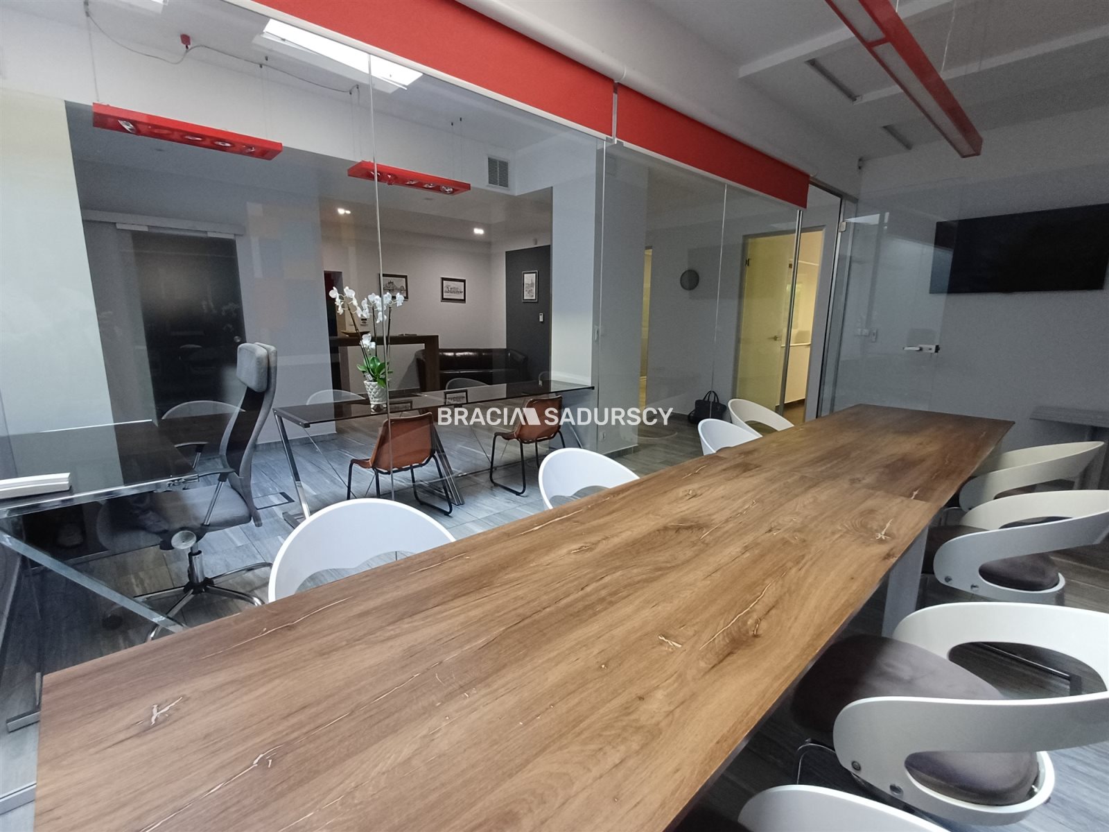 przeszklona sala konferencyjna z ekranem i pełnym umeblowaniem,