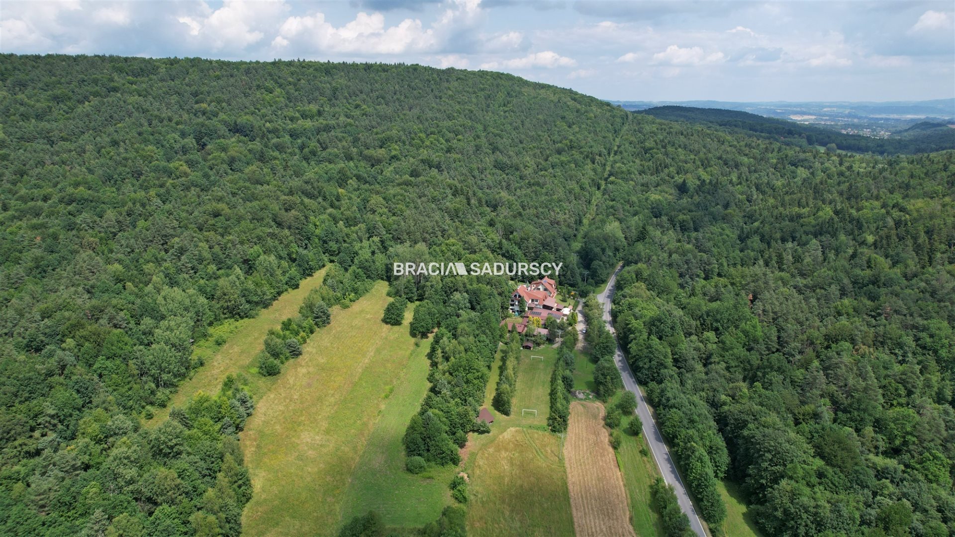Budynek posadowiony jest na działkach o pow. 25 a, natomiast łączna powierzchnia nieruchomości wynosi ok. 1,45 ha zapewniając przestrzeń, prywatność oraz możliwość dalszej rozbudowy lub adaptacji.