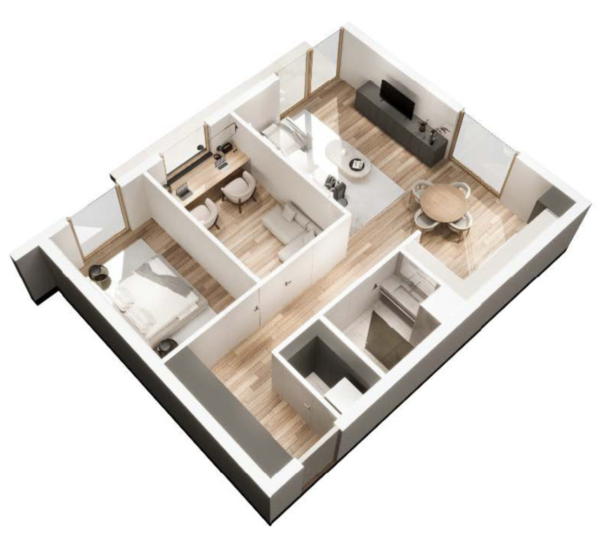 Układ mieszkania jest bardzo funkcjonalny – idealny zarówno dla singla, pary, jak i osoby starszej, która chce uniknąć schodów czy wind.