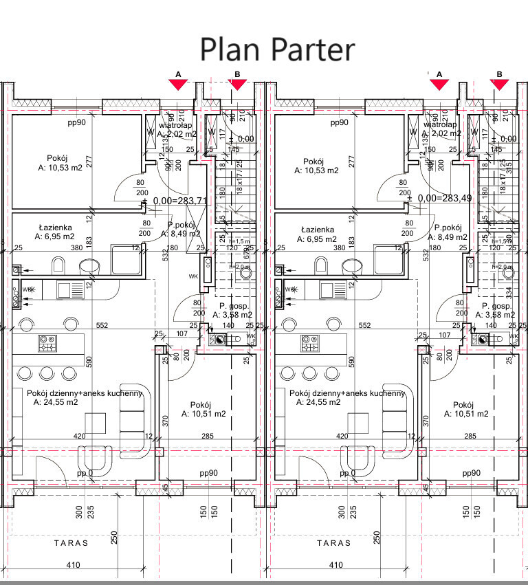 każdy budynek składa się z 12 mieszkań (6 na parterze i 6 na piętrze),