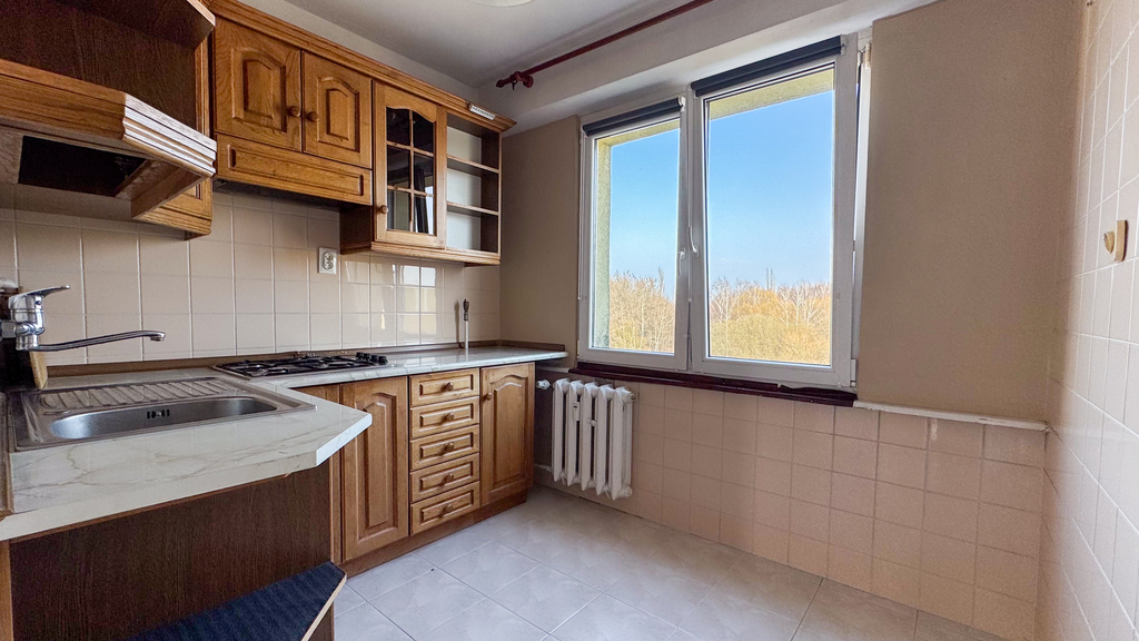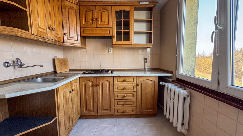 oddzielna, widna kuchnia z wyposażeniem (meble, płyta gazowa, zlewozmywak),