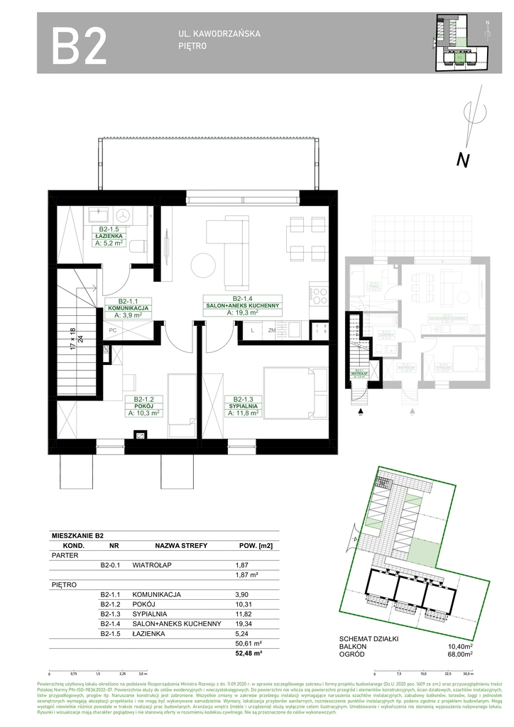 Układ pomieszczeń: Wiatrołap – 1,87 m² Komunikacja – 3,90 m² Pokój – 10,31 m² Sypialnia – 11,82 m² Salon z aneksem kuchennym – 19,34 m² Łazienka – 5,24 m² Dodatkowo: Ogród o powierzchni ok. 68 m² Balkon o powierzchni ok. 10 m² Komórka lokatorska (ok. 1.2 x 2 m²) 2 miejsca parkingowe (dodatkowo płatne – 20 000 zł) Funkcjonalność na najwyższym poziomie: Przemyślany układ 3 pokoi na 52 m² zapewnia maksymalne wykorzystanie przestrzeni – idealne rozwiązanie zarówno dla rodziny, jak i osób pracujących zdalnie.