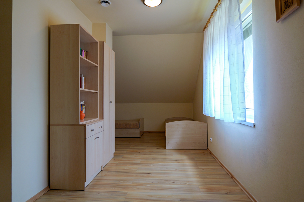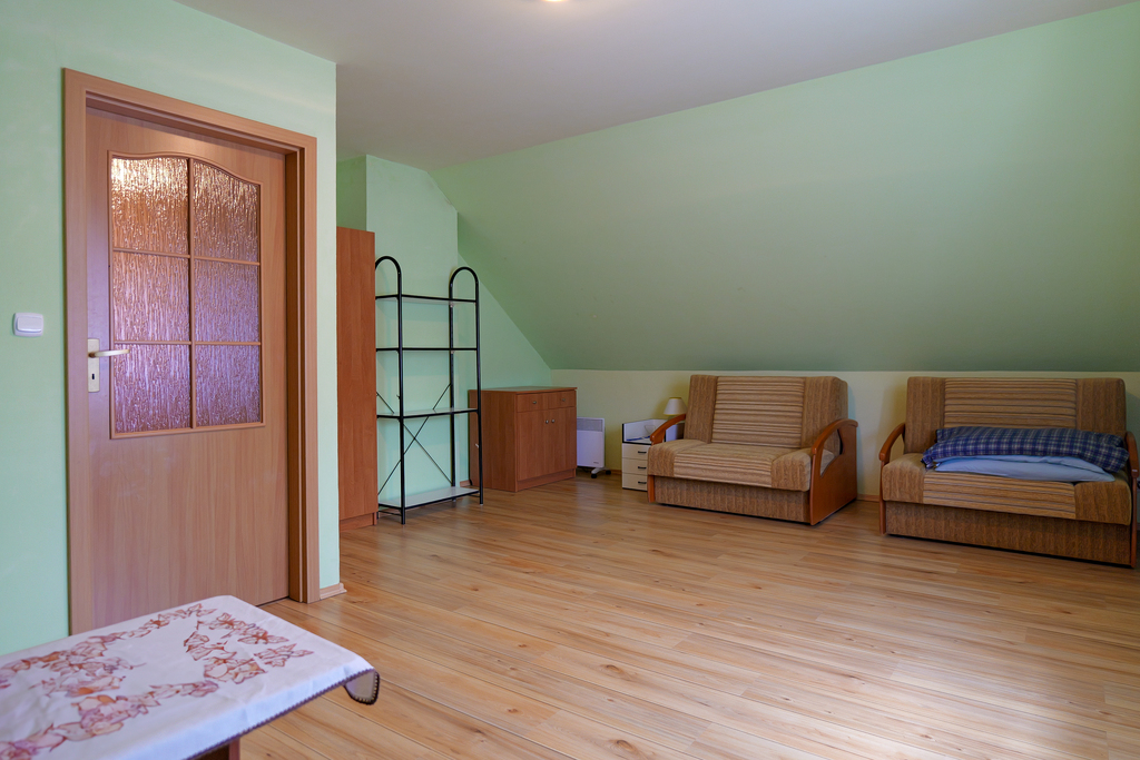5 pokoi w tym salon z kuchnią z pełnym wyposażeniem i spiżarką, 1 łazienka (wyposażenie: wc, umywalka, prysznic, pralkę),oddzielna toaleta,poddasze do adaptacji.