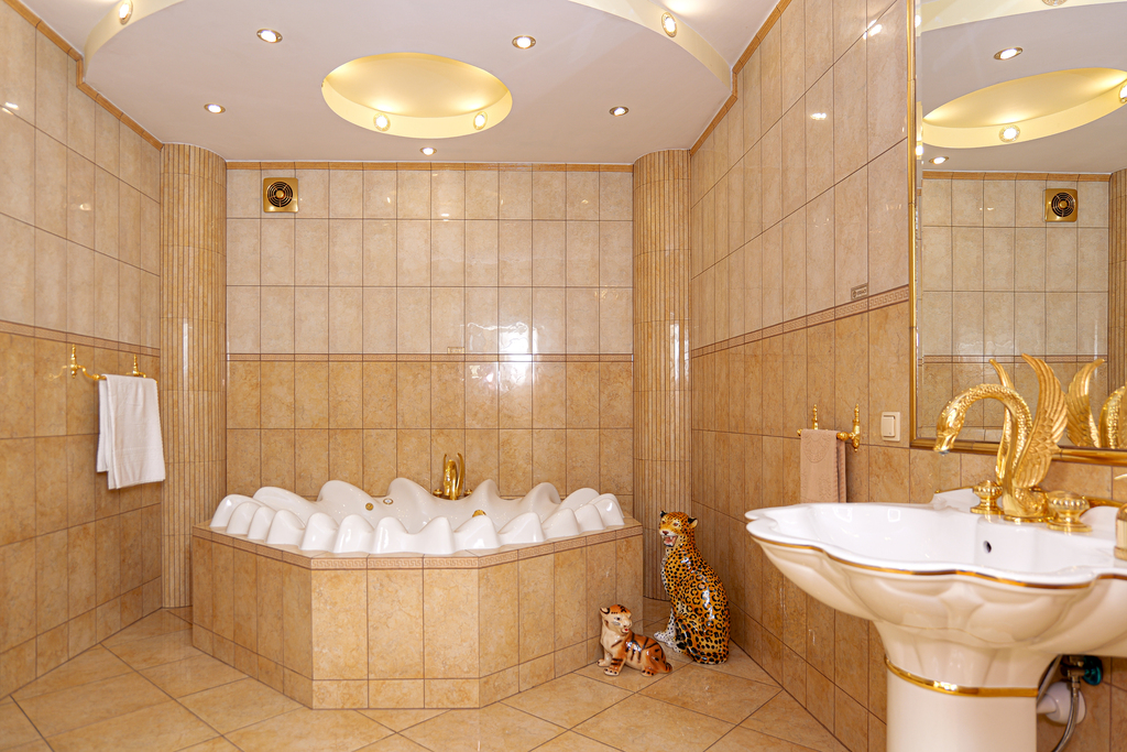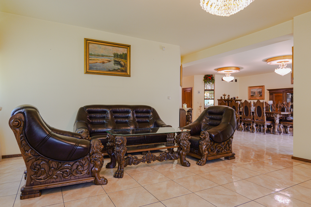 Parter: duży salon z barkiem, jadalnia, łazienka, kuchnia ze spiżarnią, pokój, Piętro: duży pokój połączony z małym, pokój z wyjściem na wspólny balkon, łazienka z jacuzzi, sypialnia z łazienką.