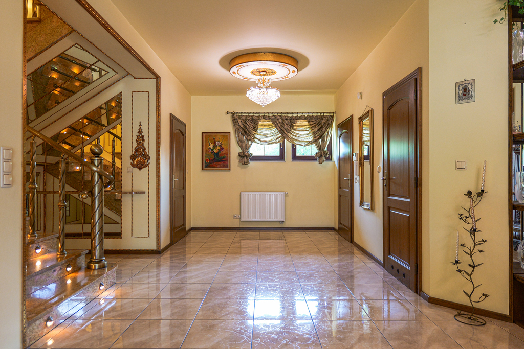 Piętro: pokój z siłownią, łazienka, pralnia, pokój z wyjściem na balkon, duża garderoba,