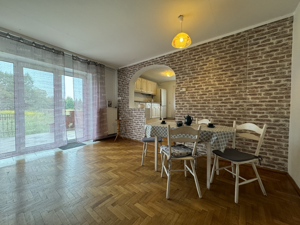 - Kuchnia w pełni wyposażona w sprzęt AGD (kuchenka gazowa, lodówka, okap), połączona z jadalnią, idealną do rodzinnych posiłków.