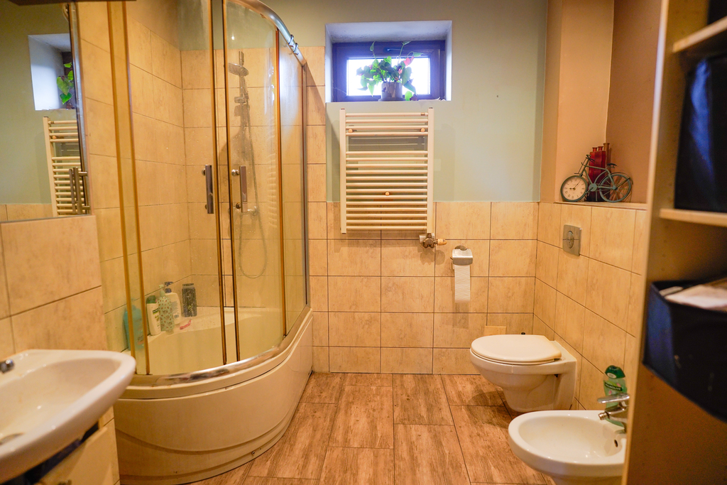 łazienki z kompletnym wyposażeniem (prysznic, umywalka, WC, bidet, grzejnik).