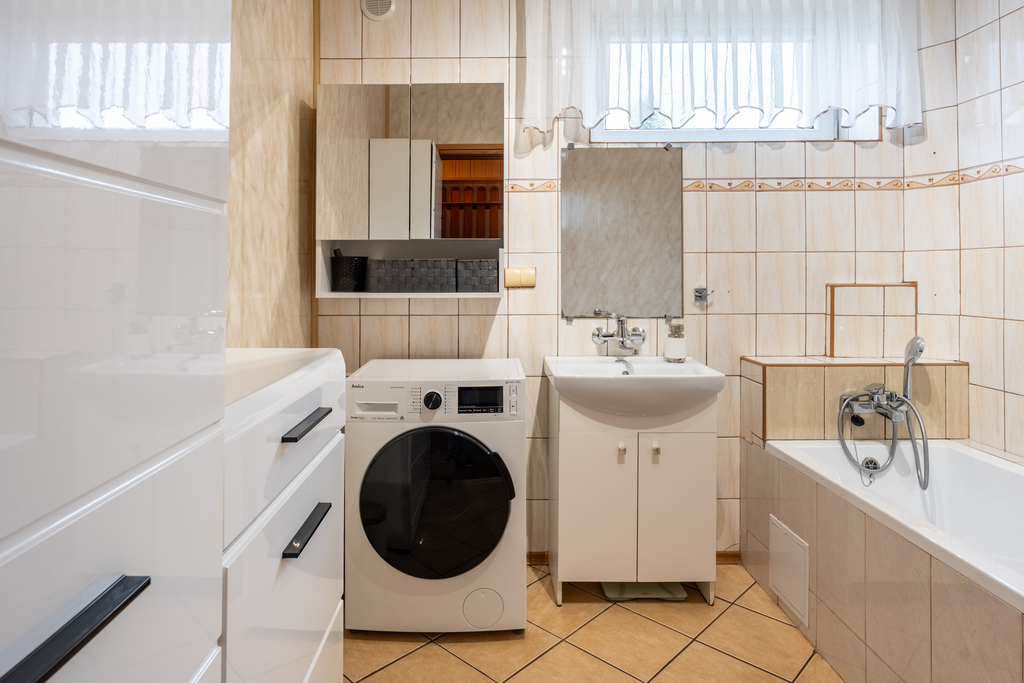 4 pokoje – w tym sypialnie oraz pokój dzienny, 2 łazienki (wyposażenie : pralka, wanna, WC, grzejnik oraz okno, kuchnia widna z wyposażeniem (meble, lodówka, okap, kuchenka), strych nieużytkowy.