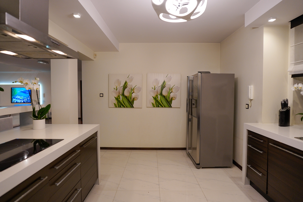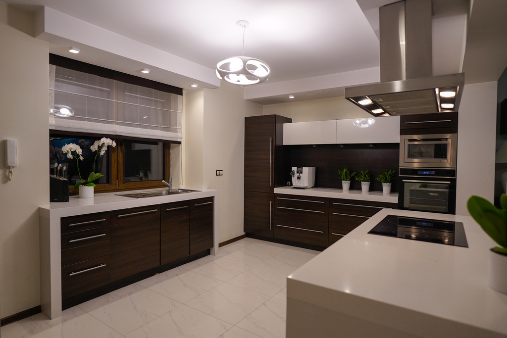 widna kuchnia z pełnym wyposażeniem: meble w zabudowie, lodówka, zmywarka, okap, piekarnik, mikrofalówka, płyta elektryczna,