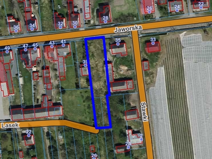 Działki o powierzchni łącznej ~1.225 m2 i wymiarach ~16,5 m x ~82m zlokalizowane przy ul. Jaworskiej.