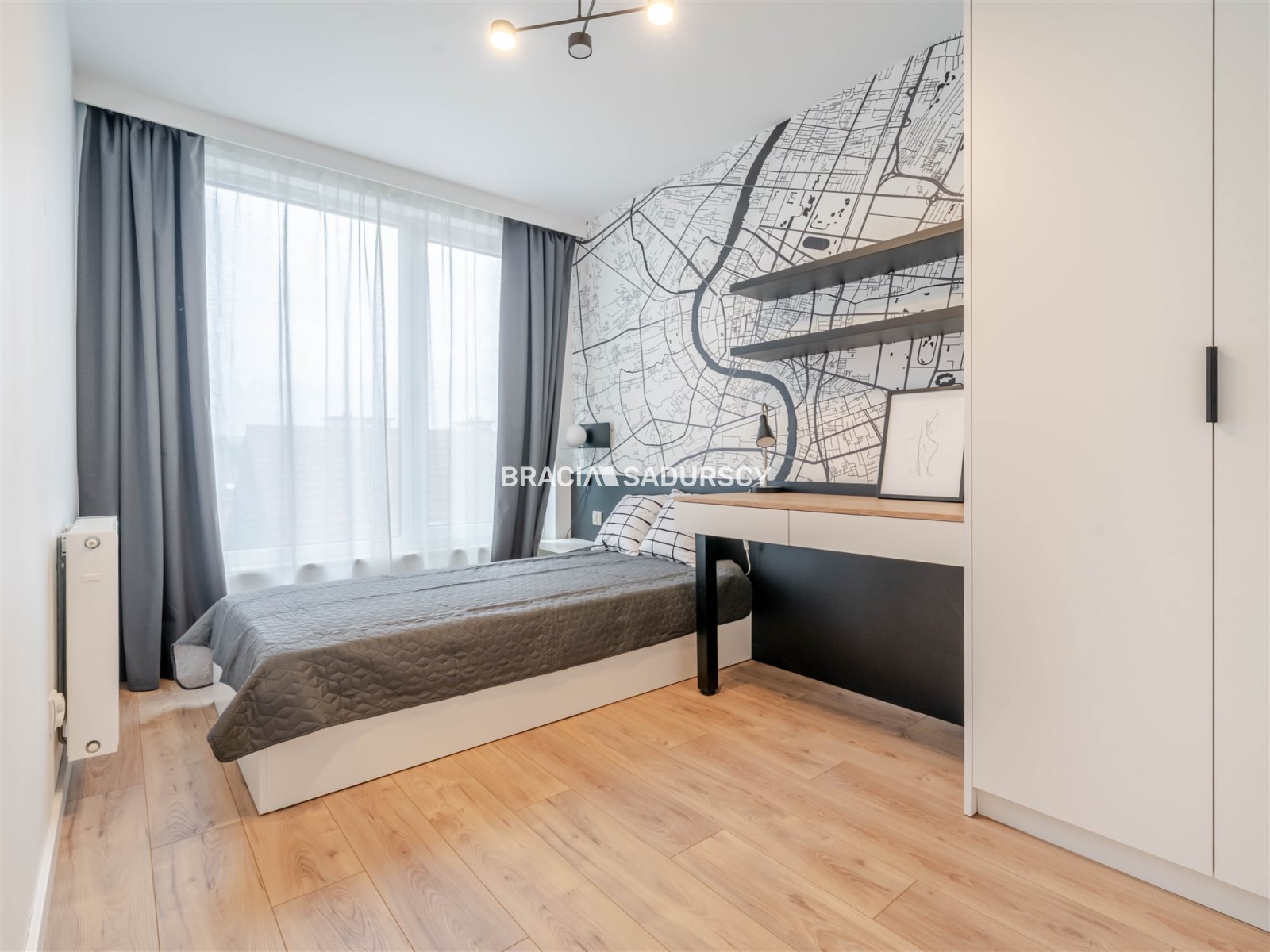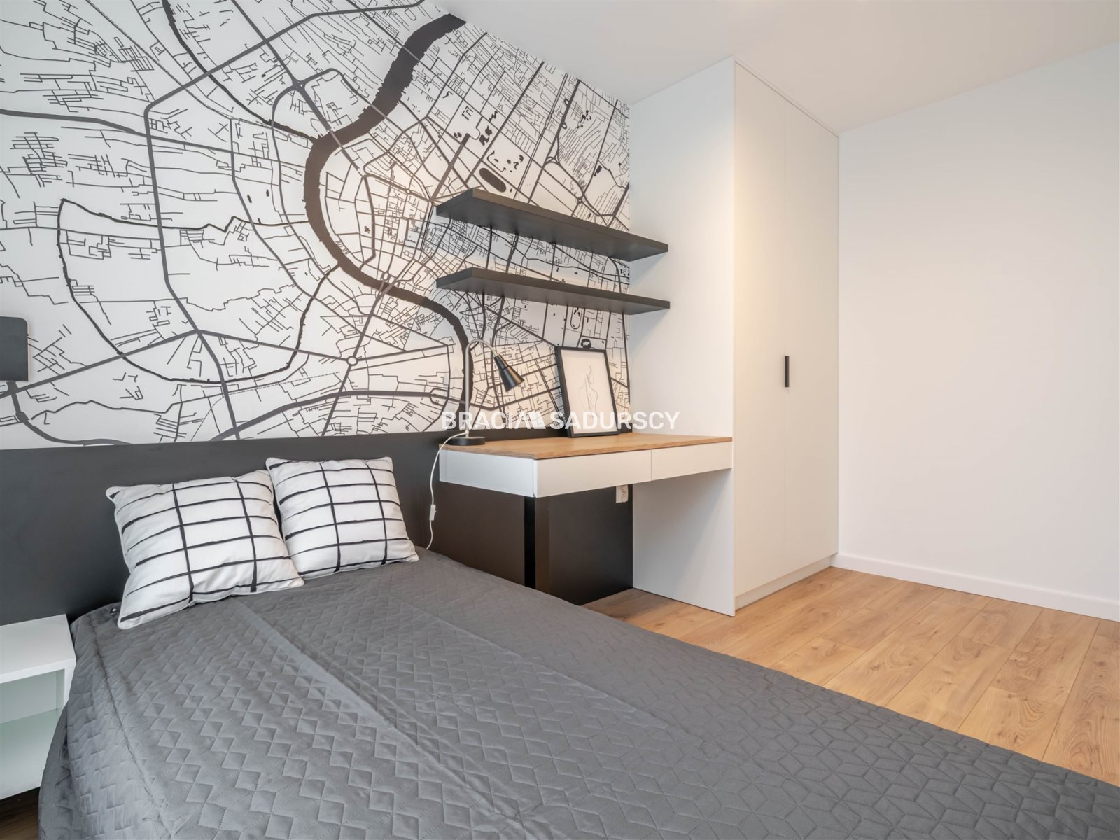 W pokoju do pracy (czy tez drugiej sypialni) szafy w zabudowie, szafka nocna, łóżko i biurko.