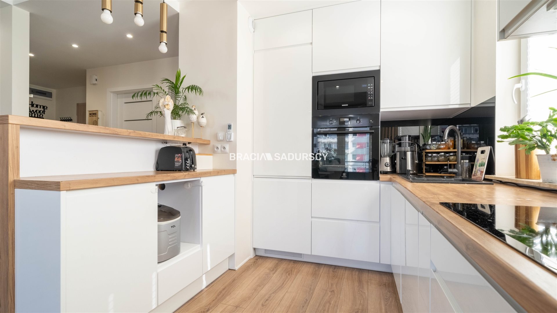 Kuchnia z pełną nowoczesną zabudową wraz ze sprzętem AGD (lodówka z zamrażarką, zmywarka, piekarnik, płyta indukcyjna, mikrofalówka, okap, kostkarka do lodu).