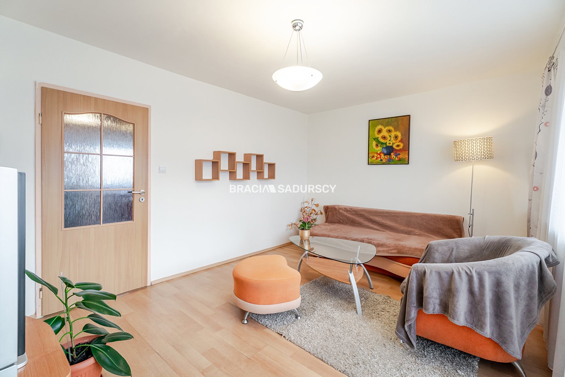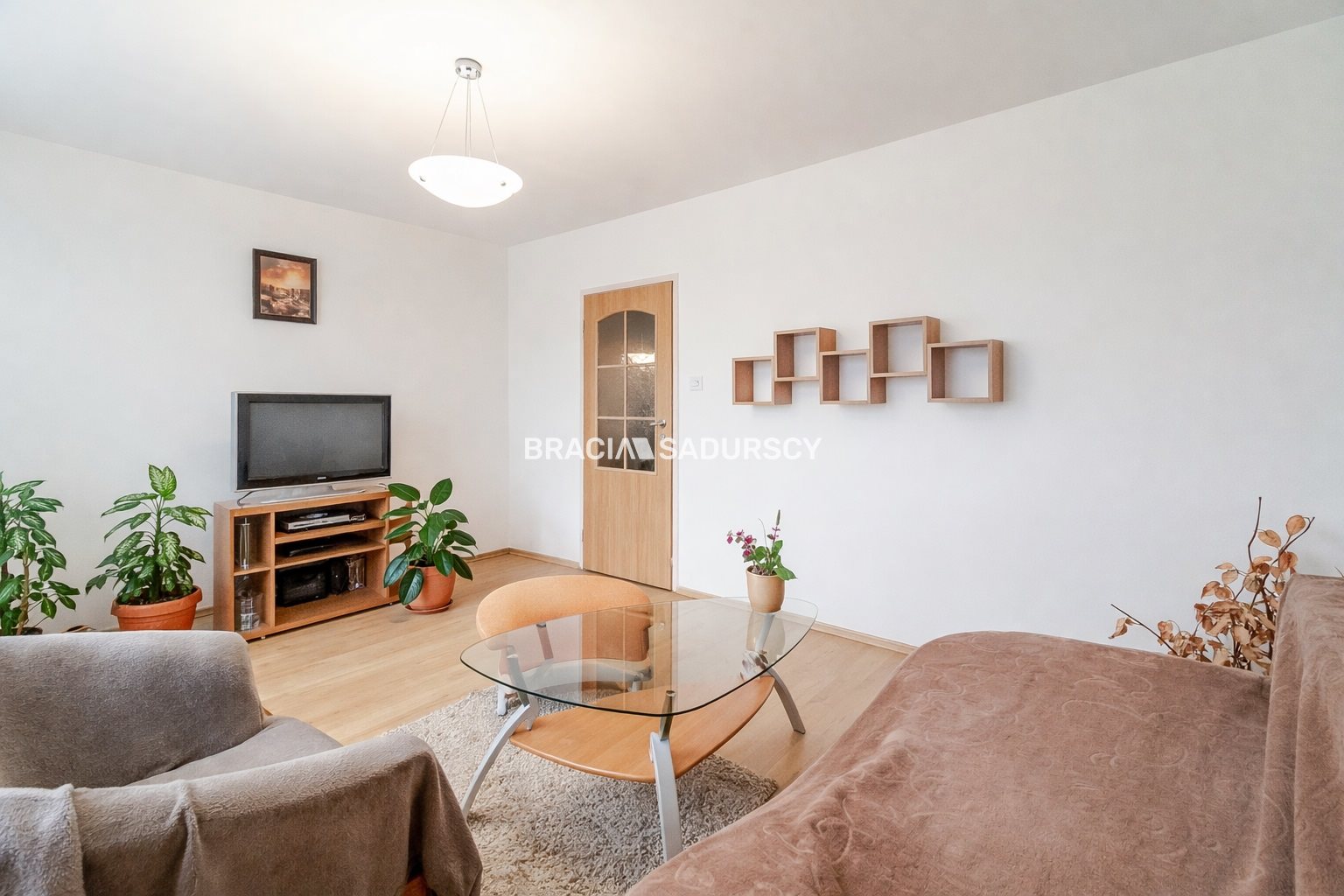 jasny salon z wyjściem na dużą, zabudowaną loggię