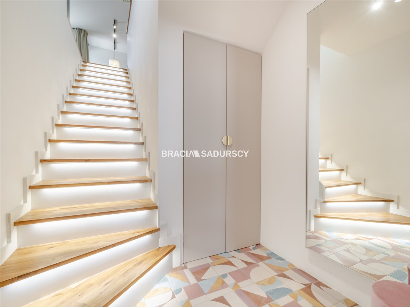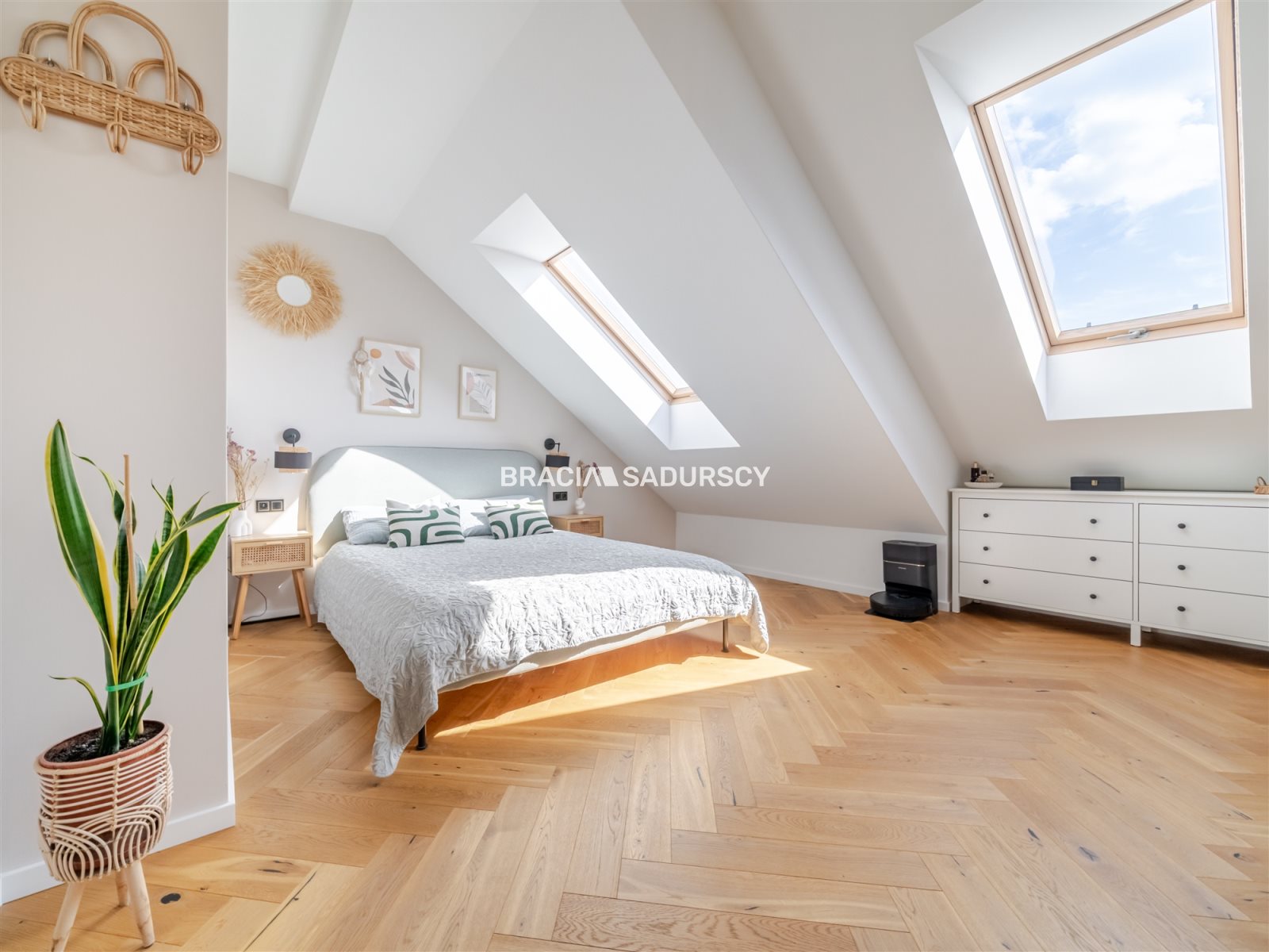 Wyższa kondygnacja stanowi strefę prywatną, sprzyjającą odpoczynkowi. Znajdują się tu trzy ustawne i jasne pokoje oraz przestronna, elegancka łazienka z ogrzewaniem podłogowym. Dodatkowym atutem jest dostęp do strychu, który można zagospodarować według własnych potrzeb. W holu oraz sypialni głównej zamontowano klimatyzatory.