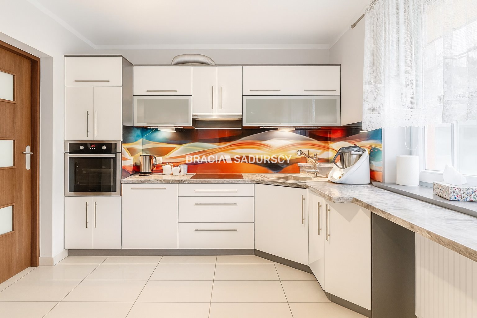 W kuchni markowe sprzęty: lodówka, płyta indukcyjna, piekarnik, klimatyzacja oraz wyjście na taras.