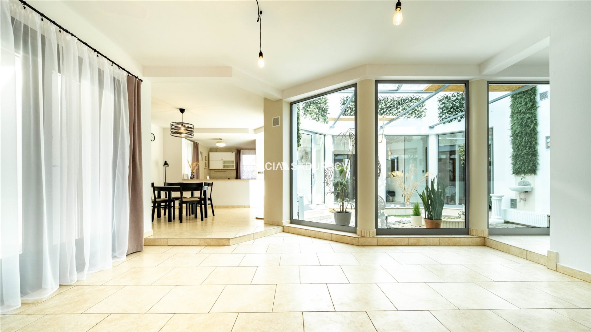 Nieruchomość wybudowana według indywidualnego projektu - na planie koła - środek nieruchomości to oranżeria z dużą ilością światła i refleksów słonecznych rozchodzących się po całym domu. Do dyspozycji najemców jest duża, jasna kuchnia z jadalnią oraz salon z wyjściem na zabudowany całoroczny taras (ogród zimowy). Do tego mamy trzy sypialnie, dużą łazienkę z wanną oraz prysznicem do wyboru, garderobę, WC i pomieszczenie gospodarcze.