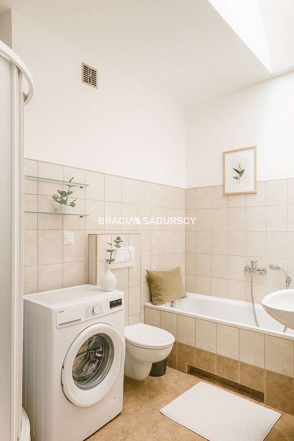 Łazienka wyposażona jest w okno dachowe, wannę i prysznic. Z balkonów roztacza się malowniczy widok na Las Wolski. Istnieje możliwość wydzielenia dodatkowego pokoju z salonu lub zamknięcia kuchni.