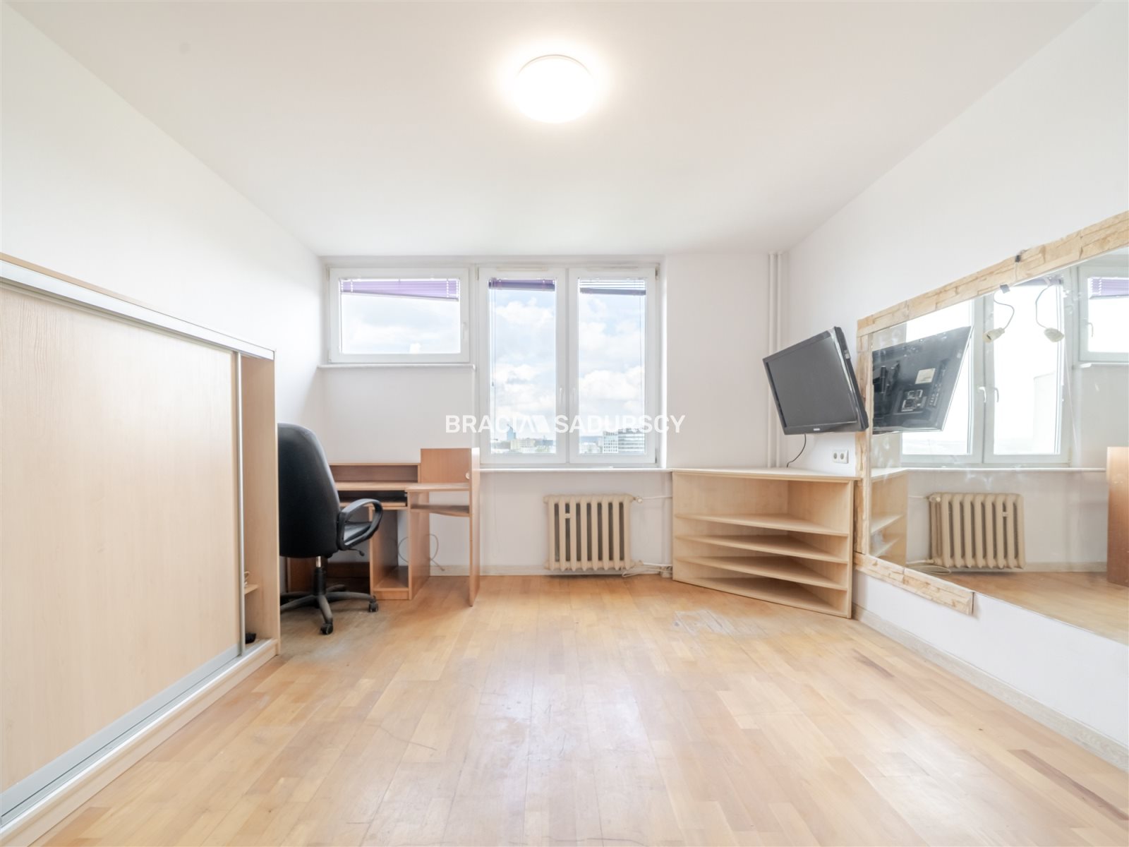 Lokal składa się z jednego pokoju, łazienki oraz aneksu kuchennego zlokalizowanego w przedpokoju. Mieszkanie posiada ekspozycję południowo-zachodnią, dzięki czemu jest dobrze doświetlone i jasne w godzinach popołudniowych. Położenie na 9. piętrze zapewnia dobre nasłonecznienie oraz większe poczucie przestrzeni.
