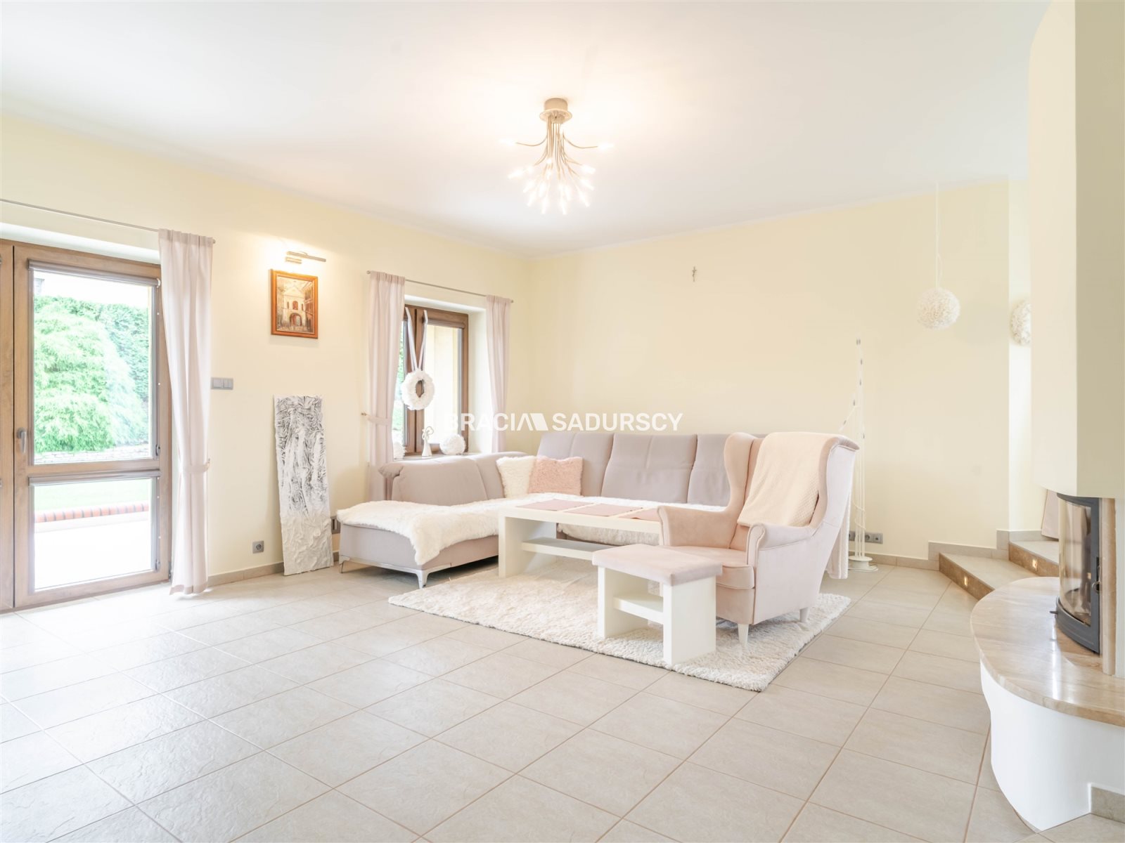 Jasny salon z kominkiem i wyjściem na taras oraz do ogrodu