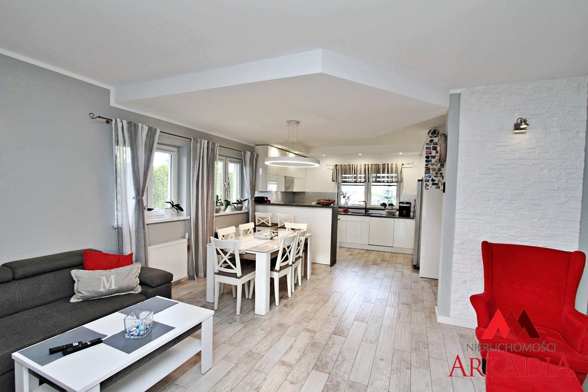 Posiada otwartą przestrzeń, gdzie kuchnia łączy się z jadalnią i salonem.