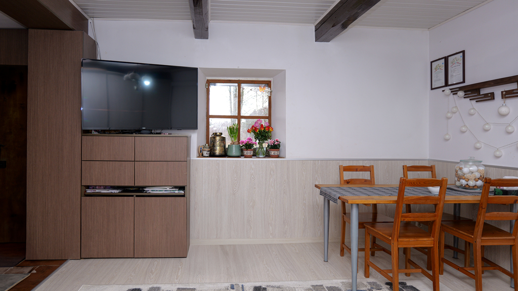 Cechy nieruchomości: powierzchnia użytkowa domu ~ 100 m², powierzchnia działki ~ 5057 m², rodzaj budynku: wolnostojący, parterowy, materiał: drewno i kamień – tworzące wyjątkowy, przytulny klimat, dach: dwuspadowy, okna: PCV oraz drewniane, drzwi wejściowe: drewniane.