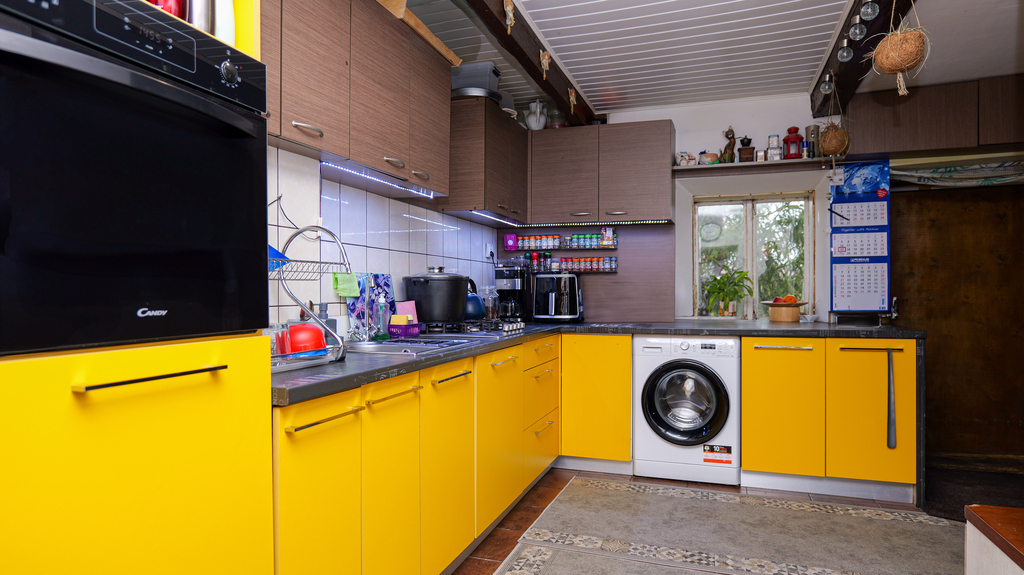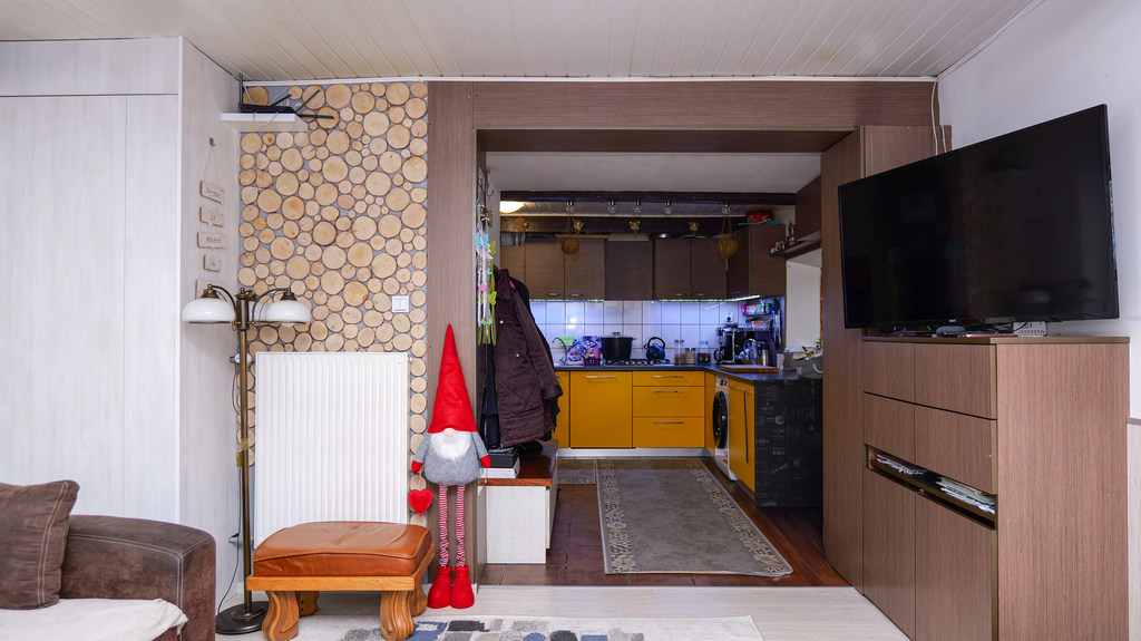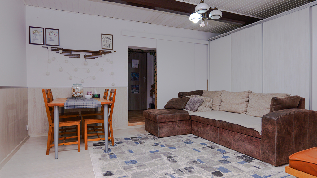 Układ pomieszczeń: salon z kominkiem,2 pokoje, kuchnia w pełni wyposażona (meble, lodówka, piekarnik, płyta gazowa), łazienka z prysznicem, umywalką oraz WC. Funkcjonalny układ zapewnia komfort codziennego użytkowania oraz możliwość dalszej aranżacji.