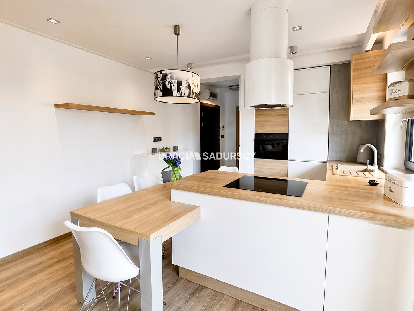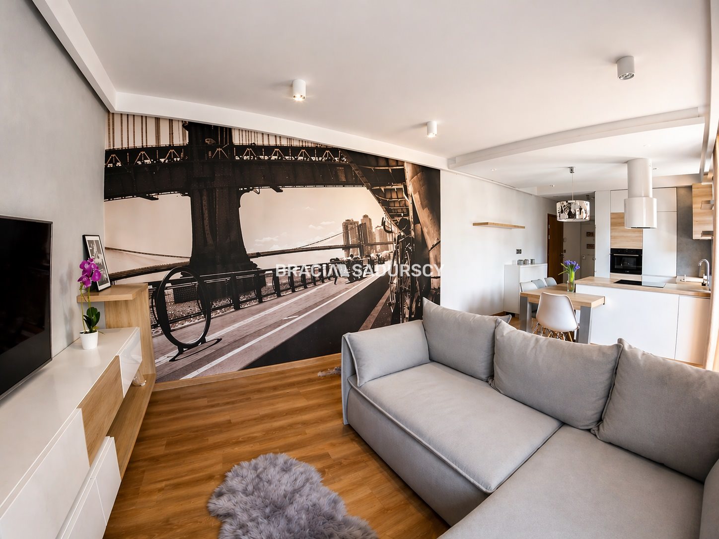 Zaraz po wejściu mieszkanie zachwyca wystrojem i przestronnością. Każdy detal jest dopracowany, a większość zabudowy robiona na specjalne zamówienie. Właścicielka zadbała o dużą ilośc miejsc do przechowywania takich jak liczne szafki i garderoba. W kuchni jest spory blat roboczy, a niższą część wyspy można wysunąć by stanowiła wolnostojący stół nawet dla sześciu osób. To przyjemne miejsce do spotkań towarzyskich.