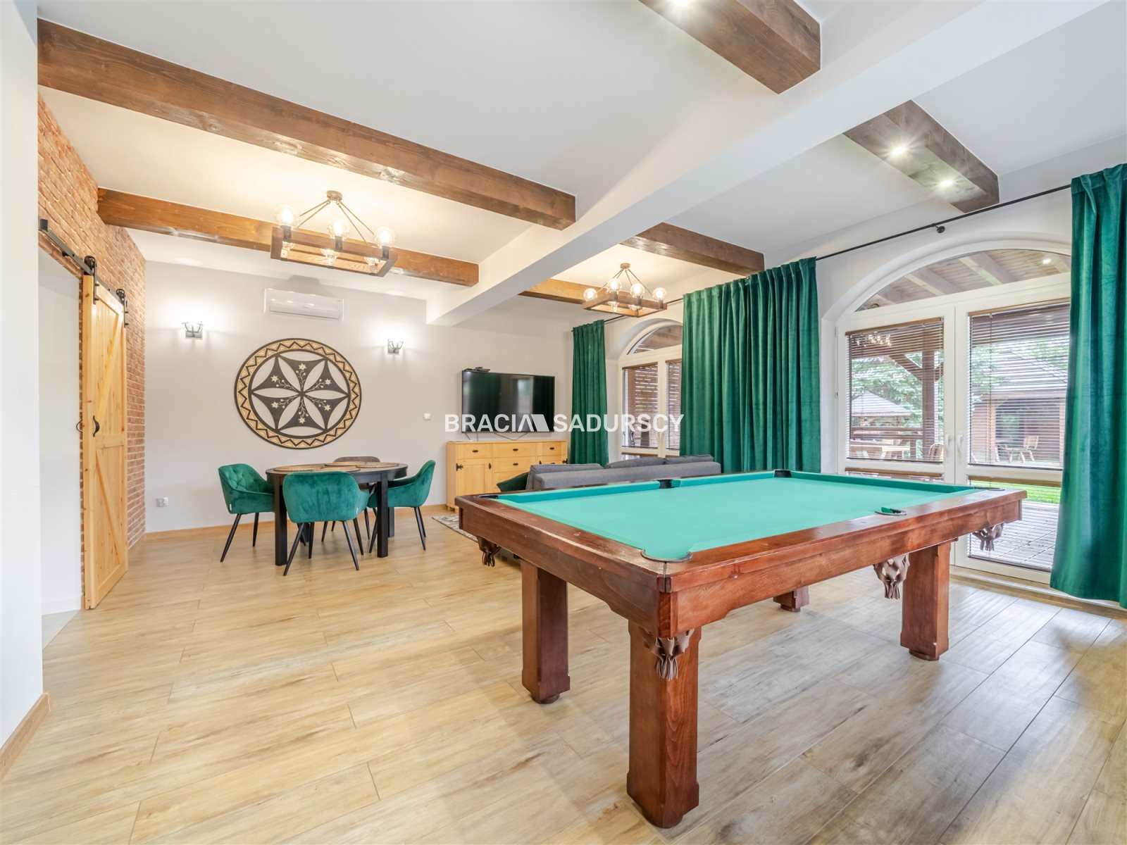 Na parterze znajduje się superkomfortowa kuchnia z jadalnią ,toaleta z pralnią , ponadto bardzo obszerny salon wypoczynkowy z wyjściem na taras. W salonie mamy kącik telewizyjny , stół bilardowy oraz miejsce (okrągły stół) do gier i spotkań towarzyskich. Całość utrzymana w klimatycznym górskim klimacie .