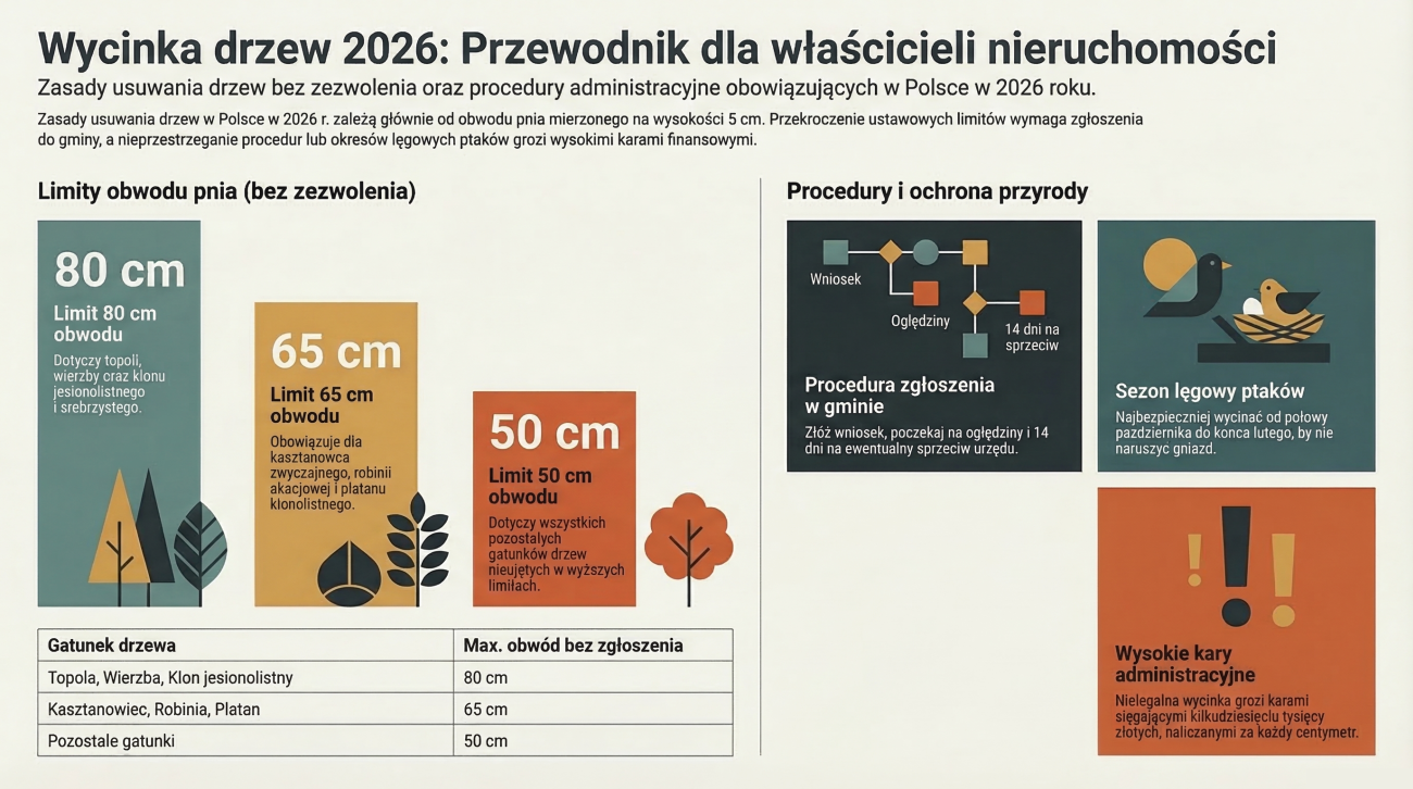 Procedura usuwania drzew i krzewów na nieruchomościach prywatnych w Polsce jest ściśle uregulowana przez ustawę o ochronie przyrody z dnia 16 kwietnia 2004 r. (Dz.U. z późn. zm.). Choć ramy prawne ewoluowały na przestrzeni lat, standardy obowiązujące w 2026 roku jasno określają granice między swobodnym zarządzaniem zielenią a koniecznością ingerencji organów administracji. Jako właściciel nieruchomości masz prawo do usuwania drzew, jednak musisz pamiętać, że niedopełnienie obowiązków formalnych – w szczególności w zakresie zgłoszenia zamiaru usunięcia drzewa – skutkuje dotkliwymi sankcjami. Niniejszy przewodnik przybliża aktualne wymogi prawne, pozwalając na przeprowadzenie prac w sposób zgodny z literą prawa.
